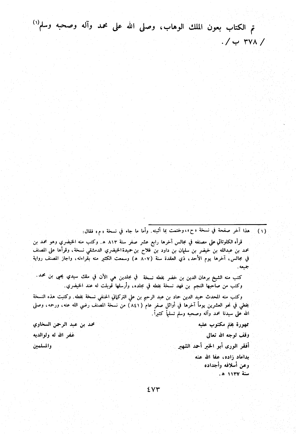 تمّ الْكتاب بعون الْملك الْوَهَّاب وَصلى الله على مُحَمَّد وَآله وَصَحبه وَسلم 378 ب