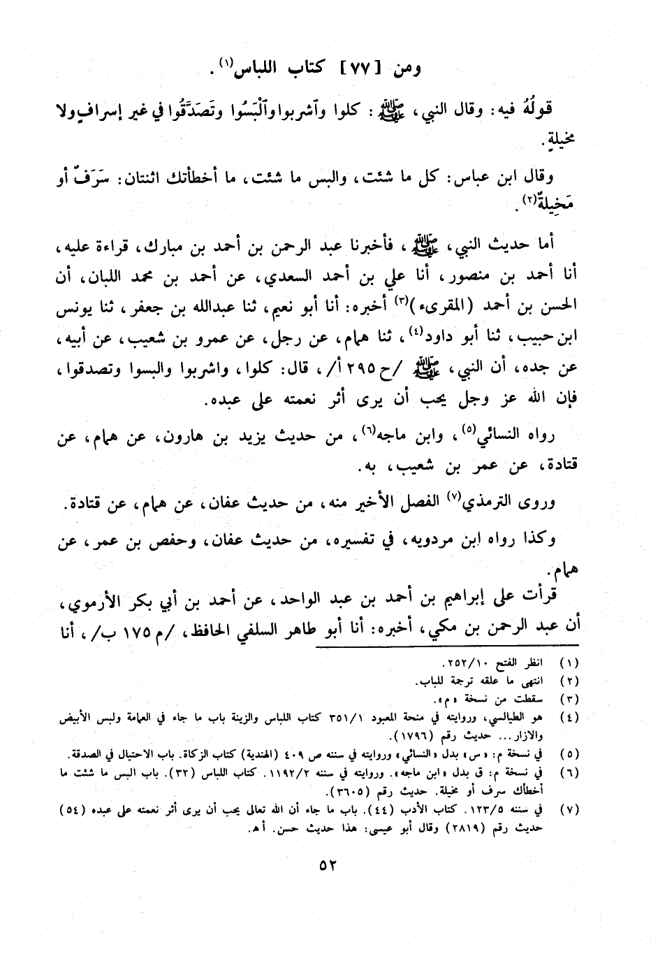 أما حَدِيث النَّبِي صلى الله عَلَيْهِ وَسلم فَأخْبرنَا عبد الرَّحْمَن بن أَحْمد بن مبارك قِرَاءَة عَليّ أَنا أَحْمَدُ بْنُ مَنْصُورٍ أَنا عَلِيَّ بْنَ أَحْمَد السَّعْدِيَّ عَنْ أَحْمَدَ بْنِ مُحَمَّدٍ اللَّبَّانِ أَنَّ الْحَسَنَ بْنَ أَحْمَدَ الْمُقْرِئَ أَخْبَرَهُ أَنا أَبُو نُعَيْمٍ ثَنَا عَبْدُ اللَّهِ بْنُ جَعْفَرٍ ثَنَا يُونُسُ ابْن حَبِيبٍ ثَنَا أَبُو دَاوُدَ ثَنَا هَمَّامٌ عَنْ رَجُلٍ عَنْ عَمْرِو بْنِ شُعَيْبٍ عَنْ أَبِيهِ عَنْ جَدِّهِ أَنَّ النَّبِيَّ صَلَّى اللَّهُ عَلَيْهِ وَسلم ح 295 أقَالَ كُلُوا وَاشْرَبُوا وَالْبَسُوا وَتَصَدَّقُوا فَإِنَّ اللَّهَ عَزَّ وَجَلَّ يُحِبُّ أَنْ يَرَى أَثَرَ نِعْمَتِهِ عَلَى عَبْدِهِ
