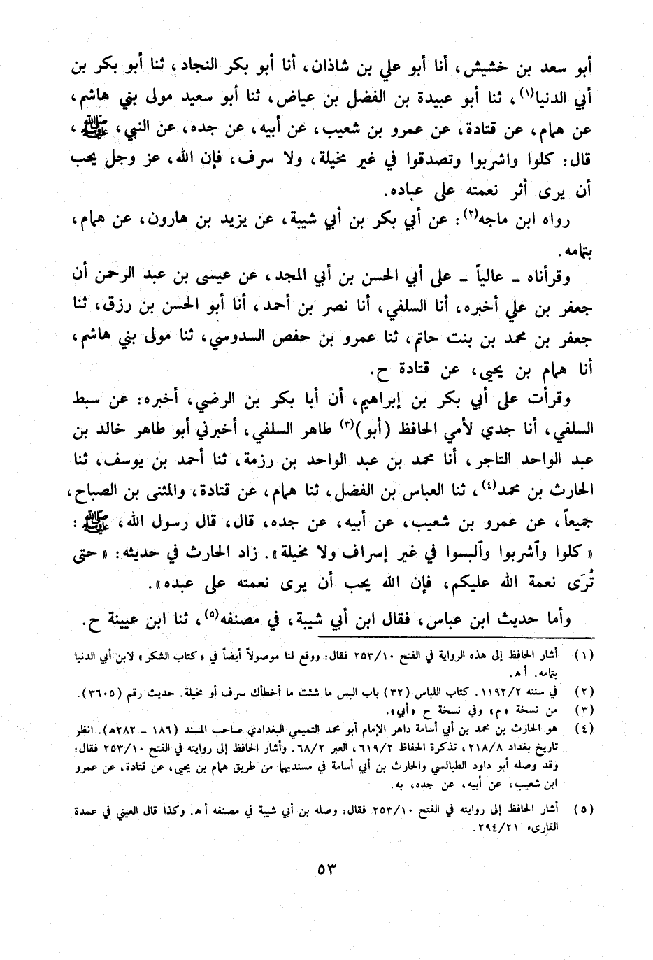 وَقرأت عَلَى أَبِي بَكْرِ بْنِ إِبْرَاهِيمَ أَنَّ أَبَا بَكْرِ بْنَ الرَّضِيِّ أَخْبَرَهُ عَنْ سِبْطِ السِّلَفِيِّ أَنا جَدِّي لأُمِّي الْحَافِظُ أَبُو طَاهِرٍ السِّلَفِيُّ أَخْبَرَنِي أَبُو طَاهِرٍ خَالِدُ بْنُ عَبْدِ الْوَاحِدِ التَّاجِرُ أَنا مُحَمَّدُ بْنُ عَبْدِ الْوَاحِدِ بْنِ رُزْمَةَ ثَنَا أَحْمَدُ بْنُ يُوسُفَ ثَنَا الْحَارِثُ بْنُ مُحَمَّدٍ ثَنَا الْعَبَّاسُ بْنُ الْفَضْلِ ثَنَا هَمَّامٌ عَنْ قَتَادَةَ وَالْمُثَنَّى بْنِ الصَّبَّاحِ جَمِيعًا عَنْ عَمْرِو بْنِ شُعَيْبٍ عَنْ أَبِيهِ عَنْ جَدِّهِ قَالَ قَالَ رَسُول الله صلى الله عَلَيْهِ وَسَلَّمَ كلوا وَاشْرَبُوا وَالْبَسُوا فِي غَيْرِ إِسْرَافٍ وَلا مَخِيلَةٍ زَادَ الْحَارِثُ فِي حَدِيثِهِ حَتَّى تُرَى نِعْمَةُ اللَّهِ عَلَيْكُمْ فَإِنَّ اللَّهَ يُحِبُّ أَنْ يَرَى نِعْمَتَهُ عَلَى عَبْدِهِ
