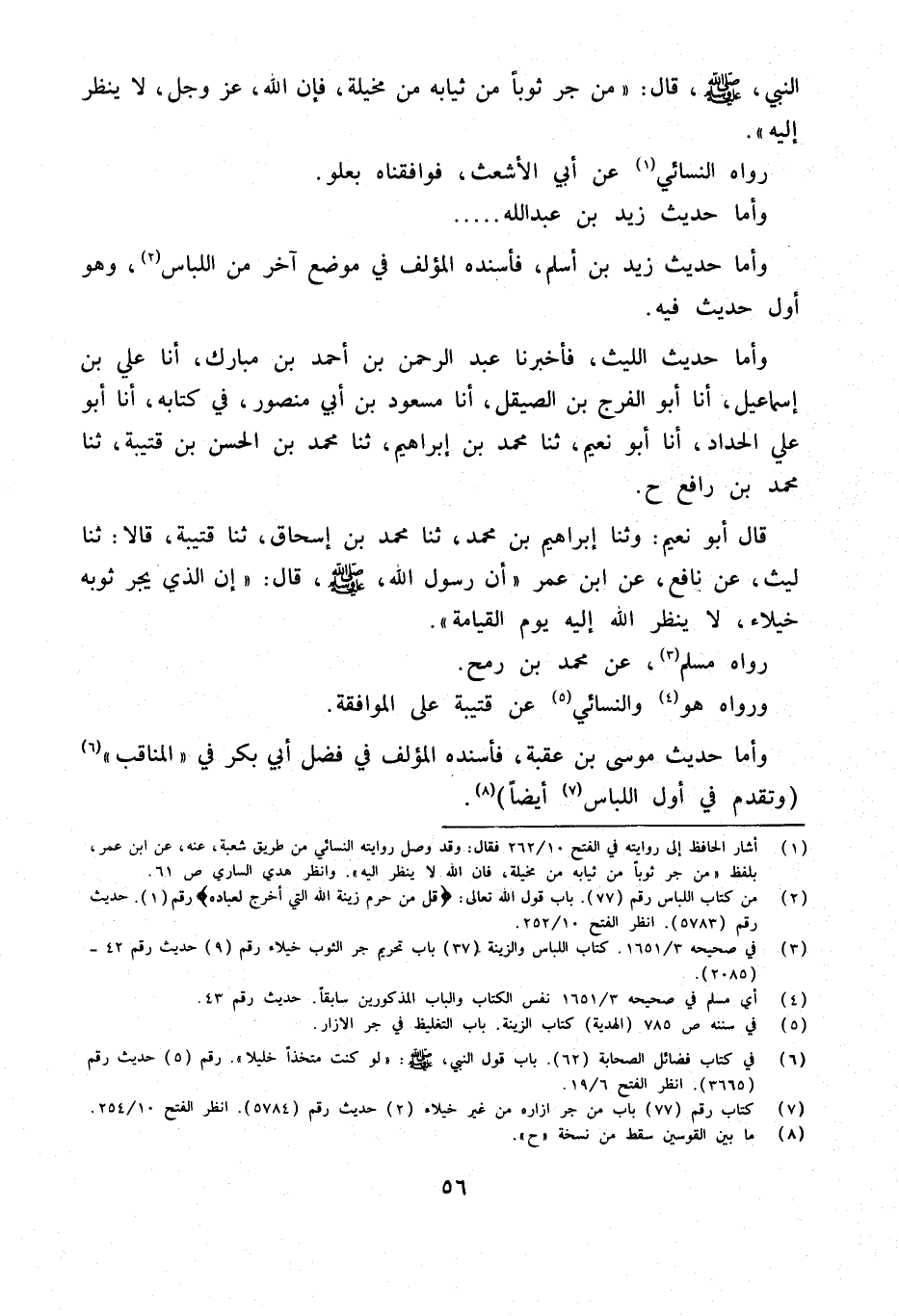 قَالَ أَبُو نُعَيْمٍ وَثنا إِبْرَاهِيمُ بْنُ مُحَمَّدٍ ثَنَا مُحَمَّدُ بْنُ إِسْحَاقَ ثَنَا قُتَيْبَةُ قَالا ثَنَا لَيْثٌ عَنْ نَافِعٍ عَنِ ابْنِ عُمَرَ أَنَّ رَسُولَ الله صلى الله عَلَيْهِ وَسلم قَالَ إِنَّ الَّذِي يَجُرُّ ثَوْبَهُ خُيَلاءَ لَا يَنْظُرُ اللَّهُ إِلَيْهِ يَوْمَ الْقِيَامَةِ