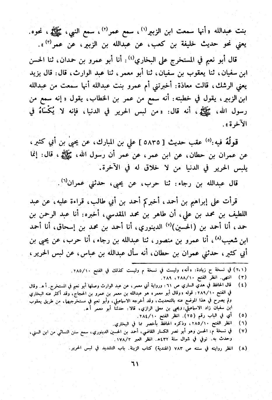 قَرَأْتُ عَلَى إِبْرَاهِيمَ بْنِ أَحْمَدَ أَخْبَرَكُمْ أَحْمَدُ بْنُ أَبِي طَالِبٍ قِرَاءَةً عَلَيْهِ عَنْ عَبْدِ اللَّطِيفِ بْنِ مُحَمَّدِ بْنِ عَلِيٍّ أَنَّ طَاهِرَ بْنَ مُحَمَّدٍ الْمَقْدِسِيَّ أَخْبَرَهُ أَنا عَبْدُ الرَّحْمَنِ بْنُ حَمْدٍ أَنا أَحْمَدُ بْنُ الْحُسَيْنِ الدِّينَوَرِيُّ أَنا أَحْمَدُ بن مُحَمَّد بن إِسْحَاق أَنا أَحْمد ابْن شُعَيْبٍ أَنا عَمْرُو بْنُ مَنْصُورٍ ثَنَا عبد الله بن رَجَاء أَنا حَرْبٌ عَنْ يَحْيَى بْنِ أَبِي كَثِيرٍ حَدَّثَنِي عِمْرَانُ بْنُ حِطَّانَ أَنَّهُ سَأَلَ عَبْدَ اللَّهِ بْنَ عَبَّاسٍ عَنْ لُبْسِ الْحَرِيرِ