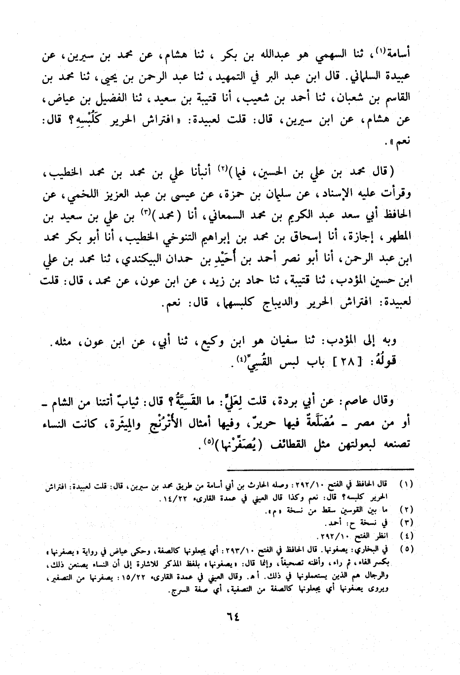 أُسَامَة ثَنَا السَّهْمِي هُوَ عبد الله بن بكر ثَنَا هِشَام عَنْ مُحَمَّدِ بْنِ سِيرِينَ عَنْ عُبَيْدَة السَّلمَانِي قَالَ ابْن عبد الْبر فِي التَّمْهِيد ثَنَا عبد الرَّحْمَن بن يحيى ثَنَا مُحَمَّد بن الْقَاسِم بن شعْبَان ثَنَا أَحْمد بن شُعَيْب أَنا قُتَيْبَة بن سعيد ثَنَا الفضيل بن عِيَاض عَن هِشَام عَن ابْن سِيرِين قَالَ قلت لعبيدة افتراش الْحَرِير كلبسه قَالَ نعم