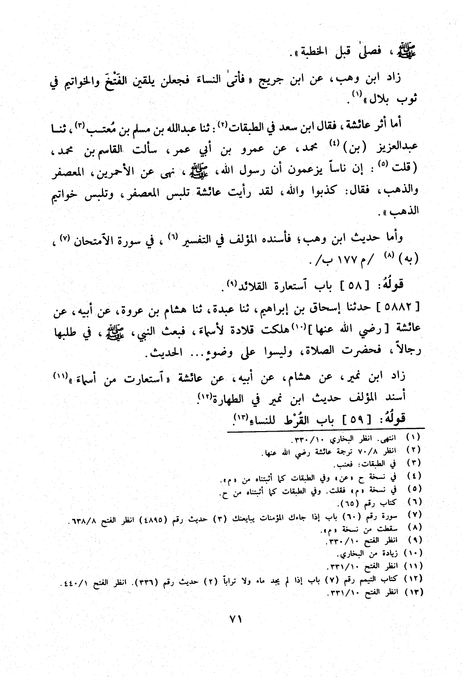 أما أثر عَائِشَة فَقَالَ ابْنُ سَعْدٍ فِي الطَّبَقَاتِ ثَنَا عَبْدُ اللَّهِ بْنُ مُسْلِمِ بْنِ مُعْتِبٍ ثَنَا عَبْدُ الْعَزِيزِ بْنِ مُحَمَّدٍ عَنْ عَمْرِو بْنِ أَبِي عُمَرَ سَأَلْتُ الْقَاسِمَ بْنَ مُحَمَّدٍ قُلْتُ إِنَّ نَاسًا يَزْعُمُونَ أَنَّ رَسُولَ اللَّهِ صَلَّى اللَّهُ عَلَيْهِ وَسَلَّمَ نَهَى عَنِ الأَحْمَرَيْنِ الْمُعَصْفَرِ وَالذَّهَبِ فَقَالَ كَذَبُوا وَاللَّهِ لَقَدْ رَأَيْتُ عَائِشَةَ تَلْبَسُ الْمُعَصْفَرَ وَتَلْبَسُ خَوَاتِيمَ الذَّهَبِ