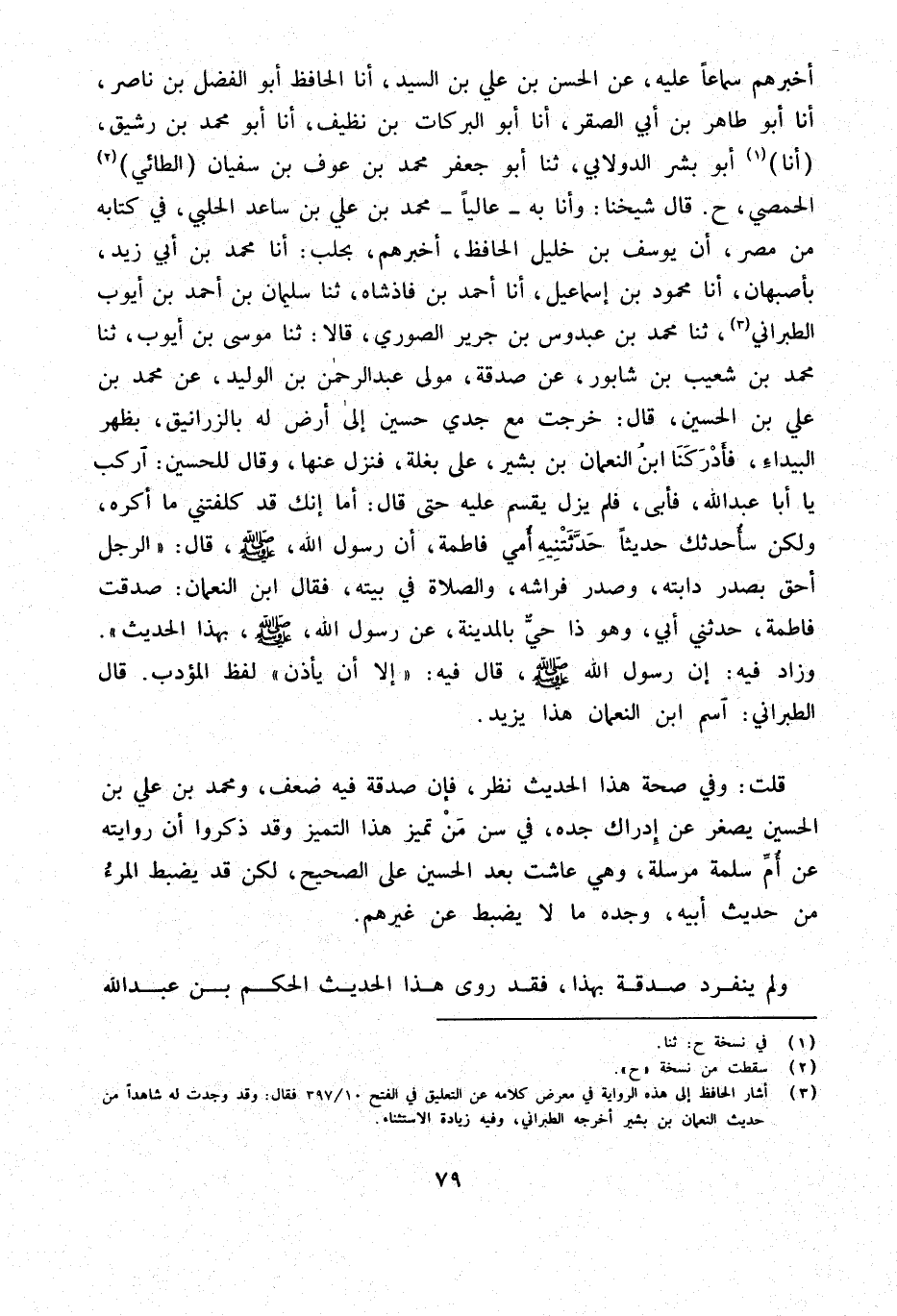 أخْبرهُم سَمَاعا عَلَيْهِ عَنِ الْحَسَنِ بْنِ عَلِيِّ بْنِ السَّيِّدِ أَنا الْحَافِظُ أَبُو الْفَضْلِ بْنُ نَاصِرٍ أَنا أَبُو طَاهِرِ بْنُ أَبِي الصَّقْرِ أَنا أَبُو الْبَرَكَاتِ بْنُ نَظِيفٍ أَنا أَبُو مُحَمَّدِ بْنُ رَشِيقٍ أَنا أَبُو بِشْرٍ الدُّولابِيُّ ثَنَا أَبُو جَعْفَرٍ مُحَمَّدُ بْنُ عَوْفِ بْنِ سُفْيَانَ الطَّائِيُّ الْحِمْصِيُّ ح قَالَ شَيْخُنَا وَأنا بِهِ عَالِيًا مُحَمَّد بن عَليّ بن ساعد الْحَلَبِيُّ فِي كِتَابِهِ مِنْ مِصْرَ أَن يُوسُف بن خَلِيل الْحَافِظ أخْبرهُم بِحَلَبَ أَنا مُحَمَّدُ بْنُ أَبِي زَيْدٍ بِأَصْبَهَانَ أَنا مَحْمُودُ بْنُ إِسْمَاعِيلَ أَنا أَحْمَدُ بْنُ فَاذْشَاهْ ثَنَا سُلَيْمَانُ بْنُ أَحْمَدَ بْنِ أَيُّوبَ الطَّبَرَانِيُّ ثَنَا مُحَمَّدُ بْنُ عَبْدُوسِ بْنِ جَرِيرٍ الصُّورِيُّ قَالا ثَنَا مُوسَى بْنُ أَيُّوبَ ثَنَا مُحَمَّدُ بْنُ شُعَيْبِ بْنِ شَابُورٍ عَنْ صَدَقَةَ مَوْلَى عَبْدِ الرَّحْمَنِ بن الْوَلِيد عَن مُحَمَّد بن عَلِيِّ بْنِ الْحُسَيْنِ قَالَ خَرَجْتُ مَعَ جَدِّي حُسَيْنٍ إِلَى أَرْضٍ لَهُ بِالزَّرَانِيقِ بِظَهْرِ الْبَيْدَاءِ فَأَدْرَكَنَا ابْنُ النُّعْمَانِ بْنِ بَشِيرٍ عَلَى بَغْلَةٍ فَنَزَلَ عَنْهَا وَقَالَ لِلْحُسَيْنِ ارْكَبْ يَا أَبَا عَبْدِ اللَّهِ فَأَبَى فَلَمْ يَزَلْ يُقْسِمُ عَلَيْهِ حَتَّى قَالَ أَمَا إِنَّكَ قَدْ كَلَّفْتَنِي مَا أَكْرَهُ وَلَكِنْ سَأُحَدِّثُكَ حَدِيثًا حَدَّثَتْنِيهِ أُمِّي فَاطِمَةُ أَنَّ رَسُول الله صلى الله عَلَيْهِ وَسَلَّمَ قَالَ الرَّجُلُ أَحَقُّ بِصَدْرِ دَابَّتِهِ وَصَدْرِ فِرَاشِهِ وَالصَّلاةِ فِي بَيْتِهِ فَقَالَ ابْنُ النُّعْمَانِ صَدَقَتْ فَاطِمَةُ حَدَّثَنِي أَبِي وَهُوَ ذَا حَيٌّ بِالْمَدِينَةِ عَنْ رَسُولِ اللَّهِ صَلَّى اللَّهُ عَلَيْهِ وَسَلَّمَ بِهَذَا الْحَدِيثِ