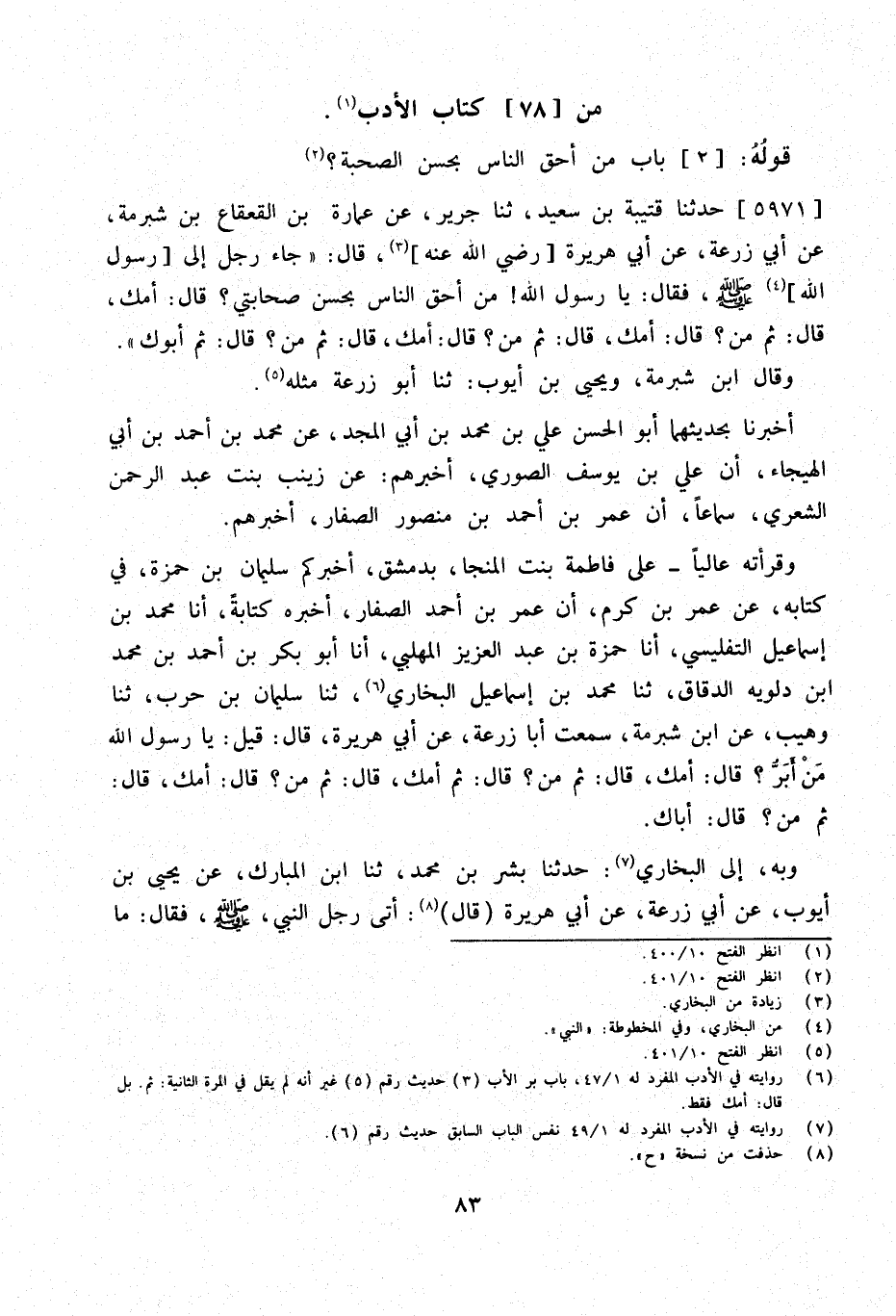 وَقَرَأْتُهُ عَالِيًا عَلَى فَاطِمَةَ بِنْتِ الْمُنَجَّا بِدِمَشْقَ أَخْبَرَكُمْ سُلَيْمَانُ بْنُ حَمْزَةَ فِي كِتَابِهِ عَنْ عُمَرَ بن كرم أَن عمر بن أَحْمَدَ الصَّفَّارَ أَخْبَرَهُ كِتَابَةً أَنا مُحَمَّد بن إِسْمَاعِيل التفليسي أَنا حَمْزَة بن عبد الْعَزِيز المهلبي أَنا أَبُو بَكْرِ بْنُ أَحْمَدَ بن مُحَمَّد ابْن دَلُّوَيْهِ الدَّقَّاقُ ثَنَا مُحَمَّدُ بْنُ إِسْمَاعِيلَ الْبُخَارِيُّ ثَنَا سُلَيْمَانُ بْنُ حَرْبٍ ثَنَا وُهَيْبٌ عَنِ ابْنِ شُبْرُمَةَ سَمِعْتُ أَبَا زُرْعَةَ عَنْ أَبِي هُرَيْرَةَ قَالَ قِيلَ يَا رَسُولَ اللَّهِ مَنْ أَبَرُّ قَالَ أُمُّكَ قَالَ ثُمَّ مَنْ قَالَ ثُمَّ أُمَّكَ قَالَ ثُمَّ مَنْ قَالَ أُمُّكَ قَالَ ثُمَّ مَنْ قَالَ أَبَاكَ