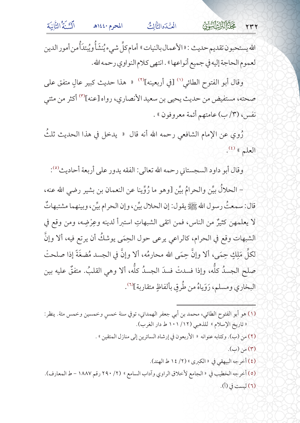 - الحلال بين والحرام بين [وهو ما روّينا عن النعمان بن بشير رضي الله عنه، قال: سمعت رسول الله صلى الله عليه وسلم يقول: إن الحلال بيّن، وإن الحرام بيّن، وبينهما مشتبهات لا يعلمهن كثير من الناس، فمن اتقى الشبهات استبرأ لدينه وعرضه، ومن وقع في الشبهات وقع في الحرام، كالراعي يرعى حول الحِمَى يوشك أن يرتع فيه، ألا وإن لكل مَلِكٍ حِمَى، ألا وإن حِمَى الله محارمه، ألا وإن في الجسد مضغة إذا صلحت صلح الجسد كله، وإذا فسدت فسد الجسد كله، ألا وهي القلب. متفقٌ عليه بين البخاري ومسلم، رَوَياه من طُرقٍ بألفاظٍ متقاربة] (¬٦).