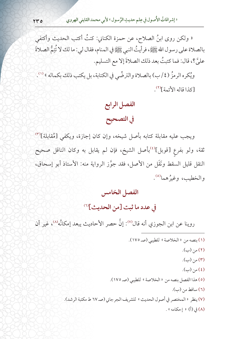"ولكن روي ابن الصلاح، عن حمزه الكناني: كنت أكتب الحديث وأكتفي بالصلاة على رسول الله صلى الله عليه وسلم، فرأيت النبي صلى الله عليه وسلم في المنام، فقال لي: مالك لا تتم الصلاة علىَّ؟، قال: فما كتبت بعد ذلك الصلاة إلا مع التسلم.