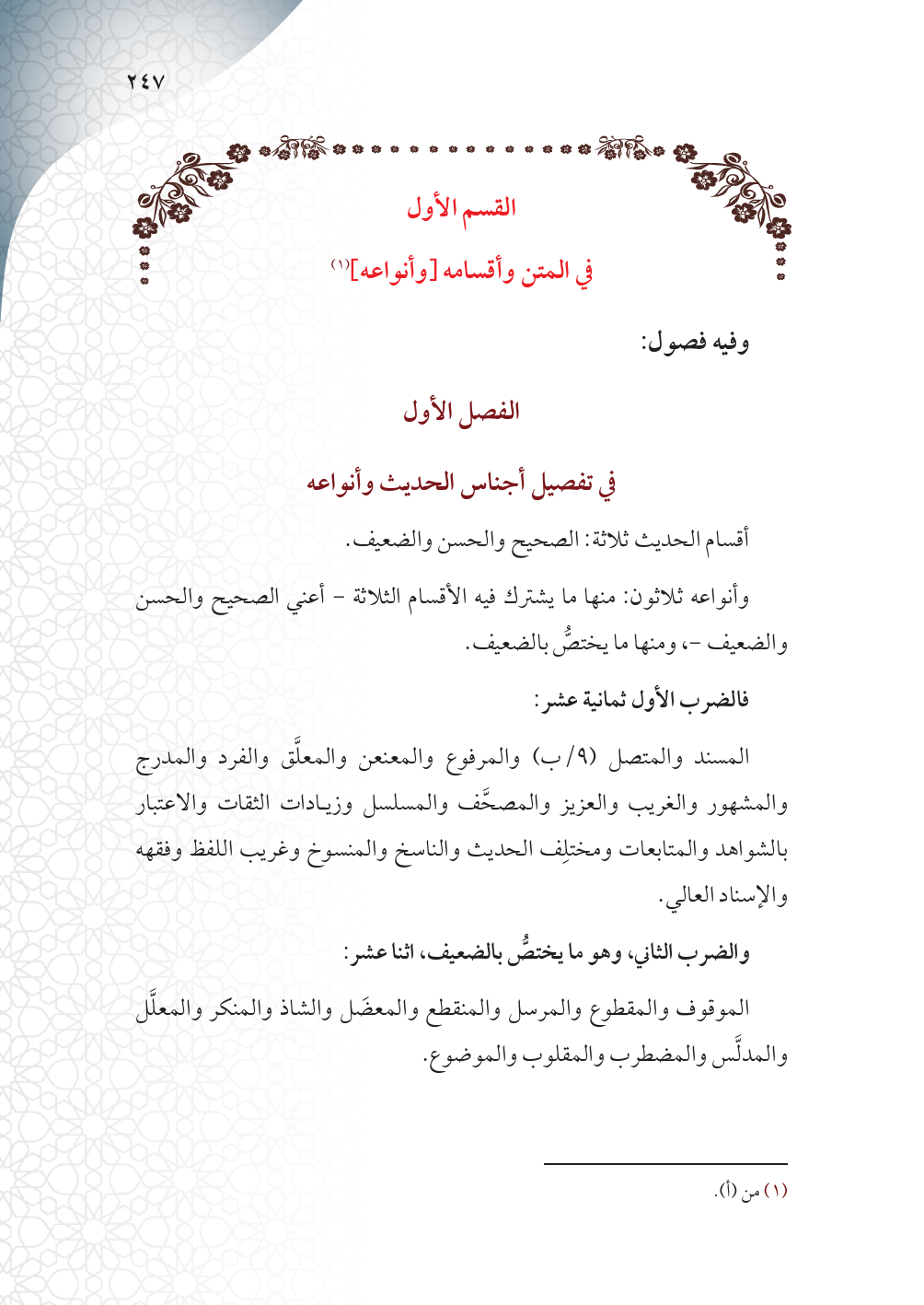 فالضرب الأول ثمانية عشر: المسند والمتصل (٩/ب) والمرفوع والمعنعن والمعلق والفرد والمدرج والمشهور والغريب والعزيز والمصحَّف والمسلسل وزيادات الثقات والاعتبار بالشواهد والمتابعات ومختلف الحديث والناسخ والمنسوخ وغريب اللفظ وفقهه والإسناد العالي.