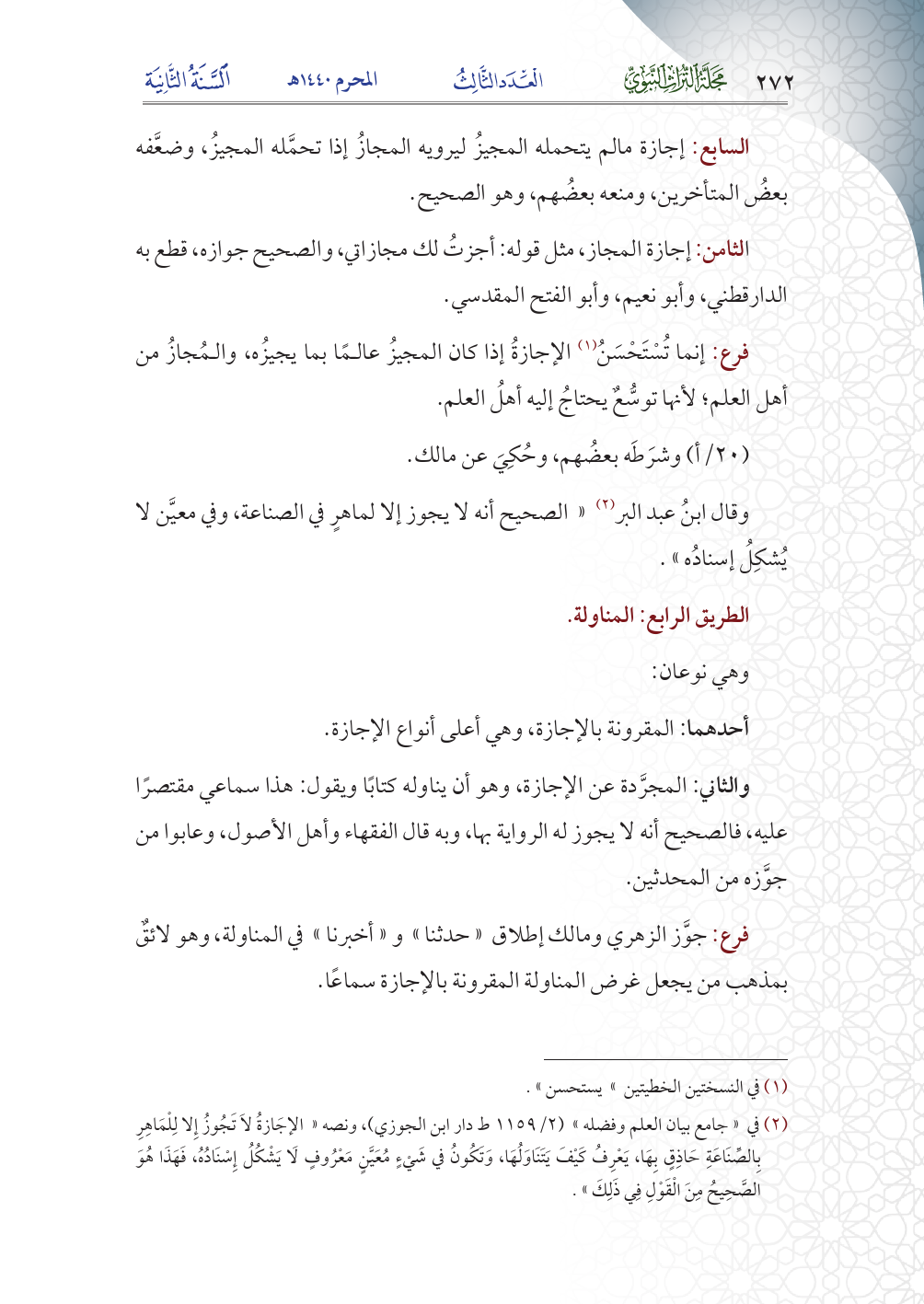 (¬١) - في "جامع بيان العلم وفضله" (٢/ ١١٥٩ ط دار ابن الجوزي)، ونصه: "الْإِجَازَةَ لَا تَجُوزُ إِلَّا لِلْمَاهِرِ بِالصِّنَاعَةِ حَاذِقٍ بِهَا يَعْرِفُ كَيْفَ يَتَنَاوَلُهَا، وَتَكُونُ فِي شَيْءٍ مُعَيَّنٍ مَعْرُوفٍ لَا يَشْكُلُ إِسْنَادُهُ، فَهَذَا هُوَ الصَّحِيحُ مِنَ الْقَوْلِ فِي ذَلِكَ".
