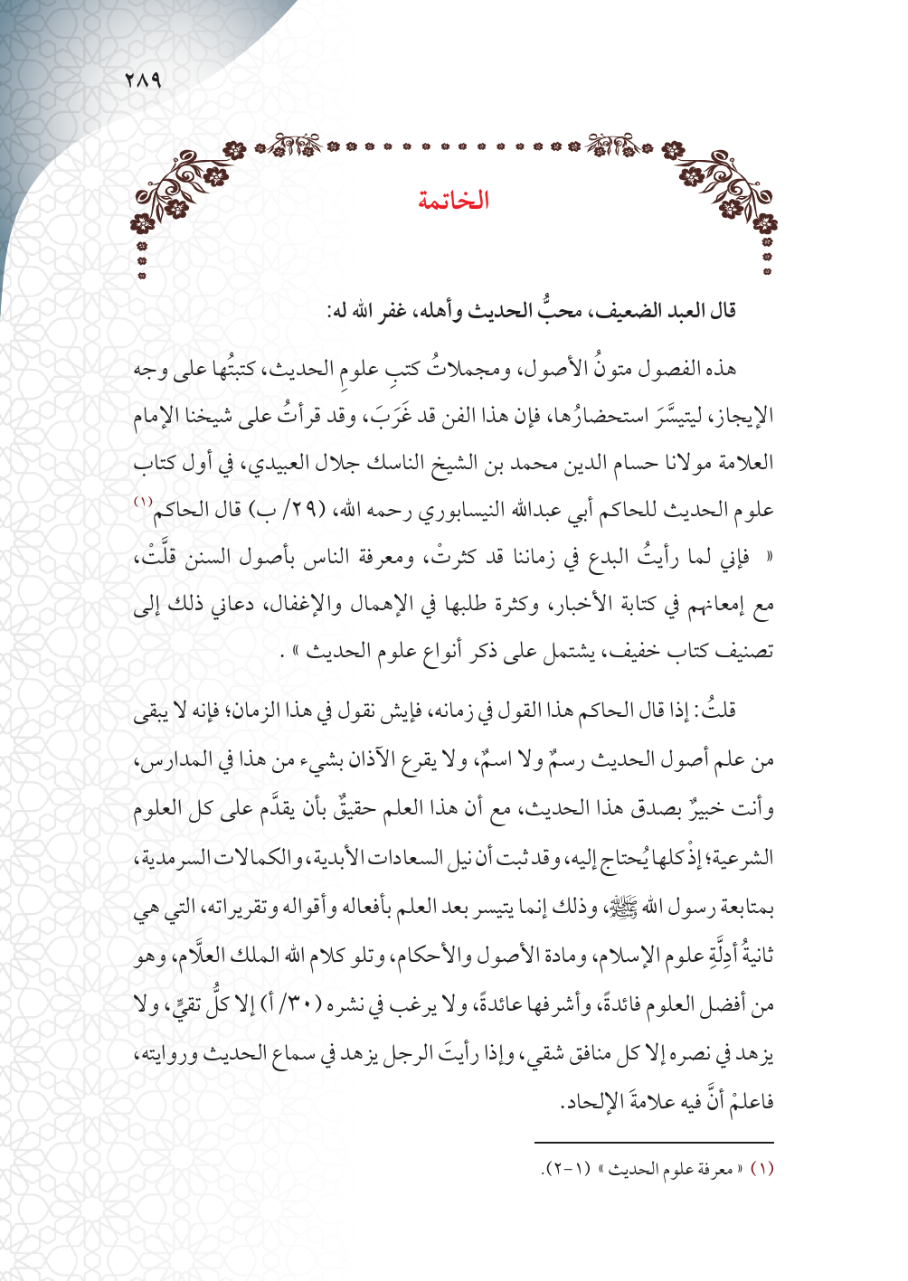 قلت: إذا قال الحاكم هذا القول في زمانه، فإيش نقول في هذا الزمان؛ فإنه لا يبقى من علم أصول الحديث رسم ولا اسم، ولا يقرع الآذان بشيئ من هذا في المدارس، وأنت خبير بصدق هذا الحديث، مع أن هذا العلم حقيق بأن يقدَّم على كل العلوم الشرعية؛ إذ كلها يحتاج إليه، وقد ثبت أن نيل السعادات الأبدية، والكمالات السرمدية، بمتابعة رسول الله صلى الله عليه وسلم، وذلك إنما يتيسر بعد العلم بأفعاله وأقواله وتقريراته، التي هي ثانية أدله علوم الاسلام، ومادة الأصول والأحكام، وتلو كلام الله الملك العلام، وهو من أفضل العلوم فائدة، وأشرفها عائدة، ولا يرغب في نشره (٣٠/أ) إلا كل تقي، ولا يزهد في نصره إلا كل منافق شقي، وإذا رأيت الرجل يزهد في سماع الحديث وروايته، فاعلم أن فيه علامة الإلحاد.