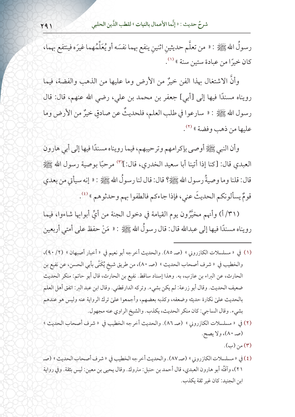 وأن الاشتغال بهذا الفن خير من الأرض وما عليها من الذهب والفضة، فيما رويناه مسنداً فيها إلى [أبي] جعفر بن محمد بن علي رضي الله عنهم قال: قال رسول الله صلى الله عليه وسلم: سارعوا في طلب العلم، فلحديث عن صادق خير من الأرض وما عليها من ذهب وفضة (¬٢).