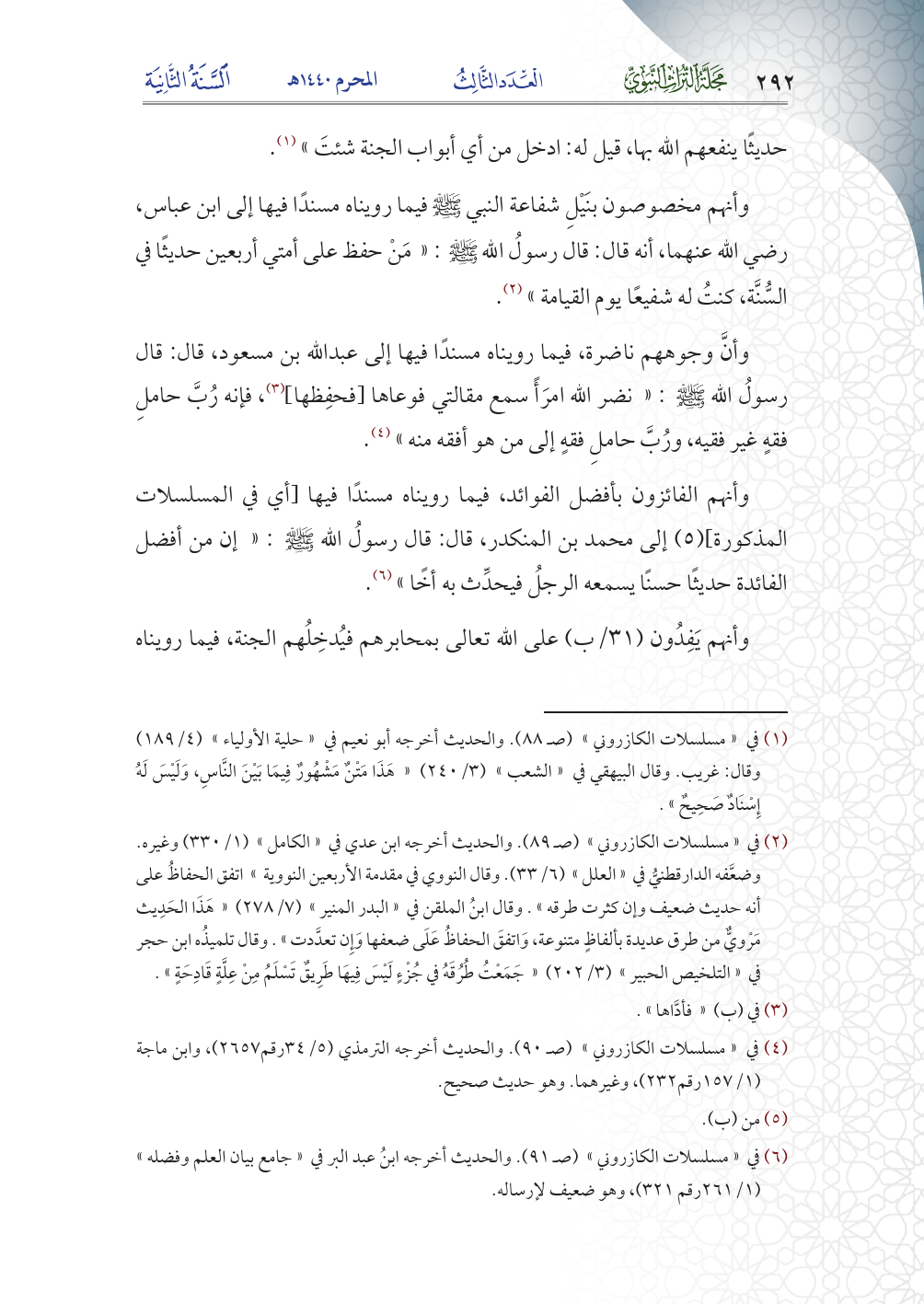 وأنهم مخصوصون بنيل شفاعة النبي صلى الله عليه وسلم، فيما رويناه مسنداً فيها إلى ابن عباس رضي الله عنهما أنه قال: قال رسول الله صلى الله عليه وسلم: من حفظ على أمتي أربعين حديثاً في السُّنَّة، كنت له شفيعاً يوم القيامة (¬٢).
