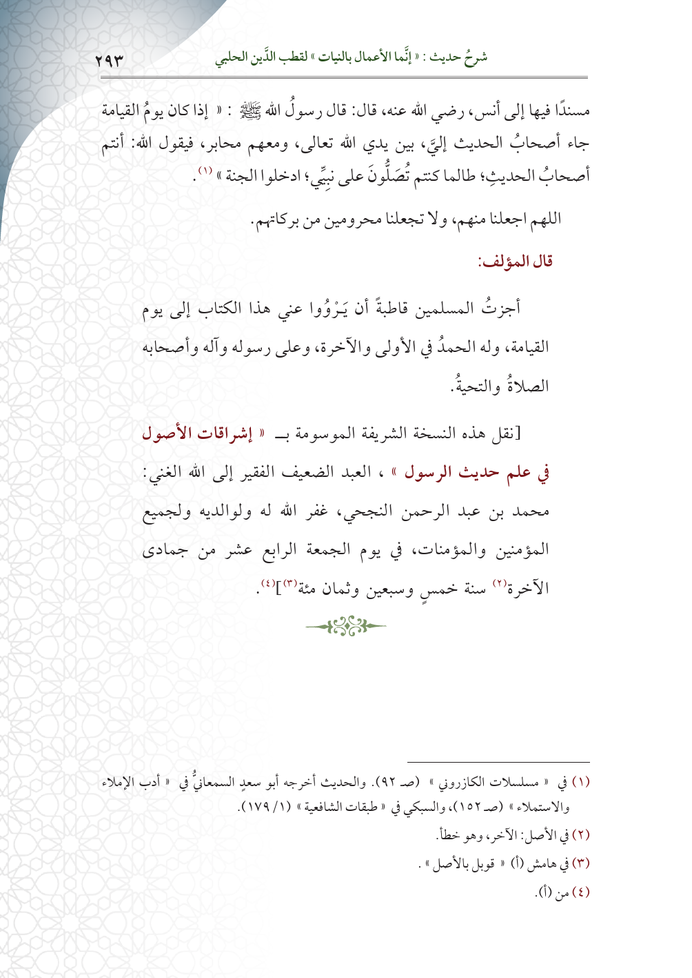 [نقل هذه النسخة الشريفة الموسومة بـ "إشراقات الأصول في علم حديث الرسول"، العبد الضعيف الفقير إلى الله الغني: محمد بن عبد الرحمن النجحي، غفر الله له ولوالديه ولجميع المؤمنين والمؤمنات، في يوم الجمعة الرابع عشر من جمادى الآخر سنة خمسٍ وسبعين وثمان مئة (¬٢)] (¬٣).