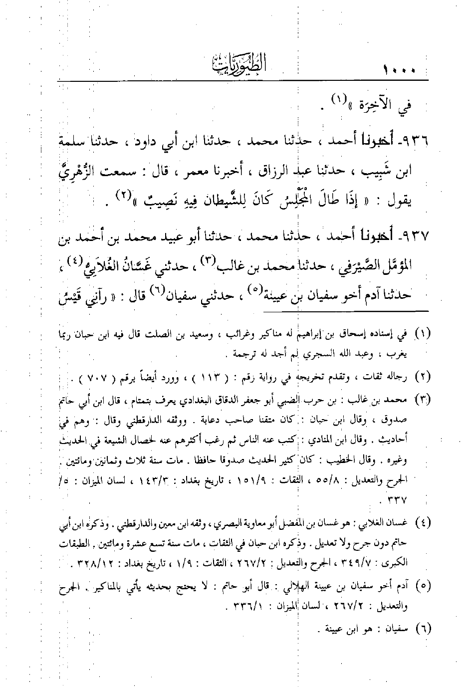 936 - أَخْبَرَنَا أَحْمَدُ، حَدَّثَنَا مُحَمَّدٌ، حَدَّثَنَا ابْنُ أَبِي دَاوُدَ، حدثنا سلمة ابن شَبِيب، حدثنا عبد الرزاق، أخبرنا معمر، قال: سمعت الزُّهْرِيَّ يقول: ((إذَا طَالَ الْمَجْلِسُ كَانَ لِلشَّيطان فِيهِ نَصِيبٌ)) (¬2) .