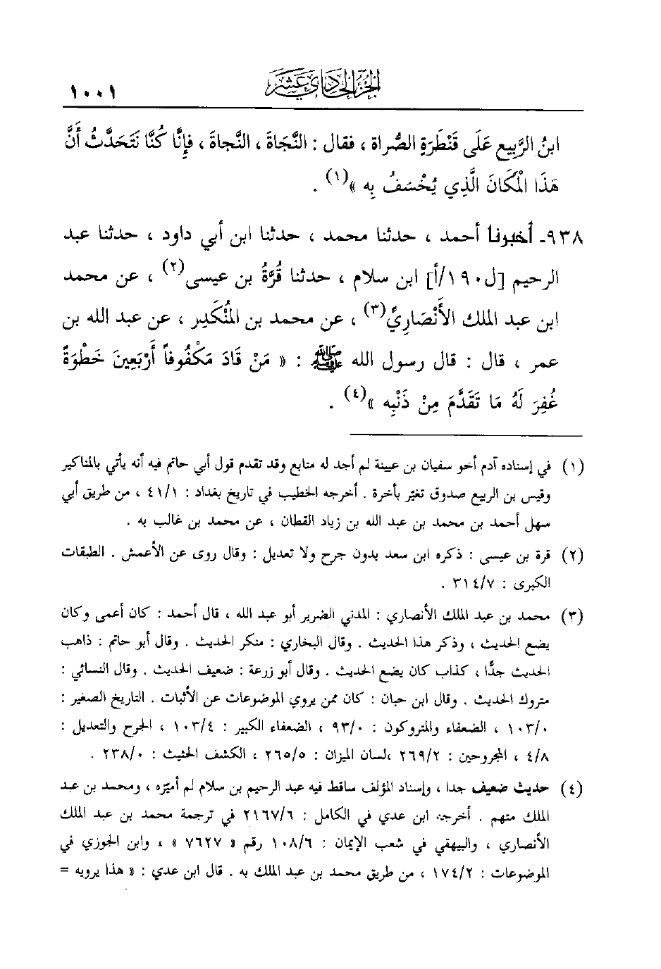 938 - أَخْبَرَنَا أَحْمَدُ، حَدَّثَنَا مُحَمَّدٌ، حَدَّثَنَا ابْنُ أَبِي دَاوُدَ، حدثنا عبد الرحيم [ل190/أ] ابن سَلامٍ، حَدَّثَنَا قُرَّةُ بْنُ عِيسَى (¬2) ، عن محمد بن عبد الملك الأَنْصَارِيِّ (¬3)