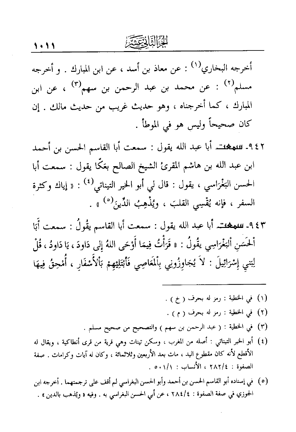 942 - سمعت أبا عبد الله يقول: سمعت أبا القاسم الْحَسَنُ بْنُ أَحْمَدَ بْنِ عَبْدِ الله بن هاشم المقرئ الشيخ الصالح بعَكّا يقول: سمعت أبا الحسن البَغْرَاسي، يقول: قال لي أبو الخير التيناتي (¬4) : ((إياك وكثرة السفر، فإنه يُقْسِي القلبَ، ويُذْهِبُ الدِّينَ (¬5)) ) .
