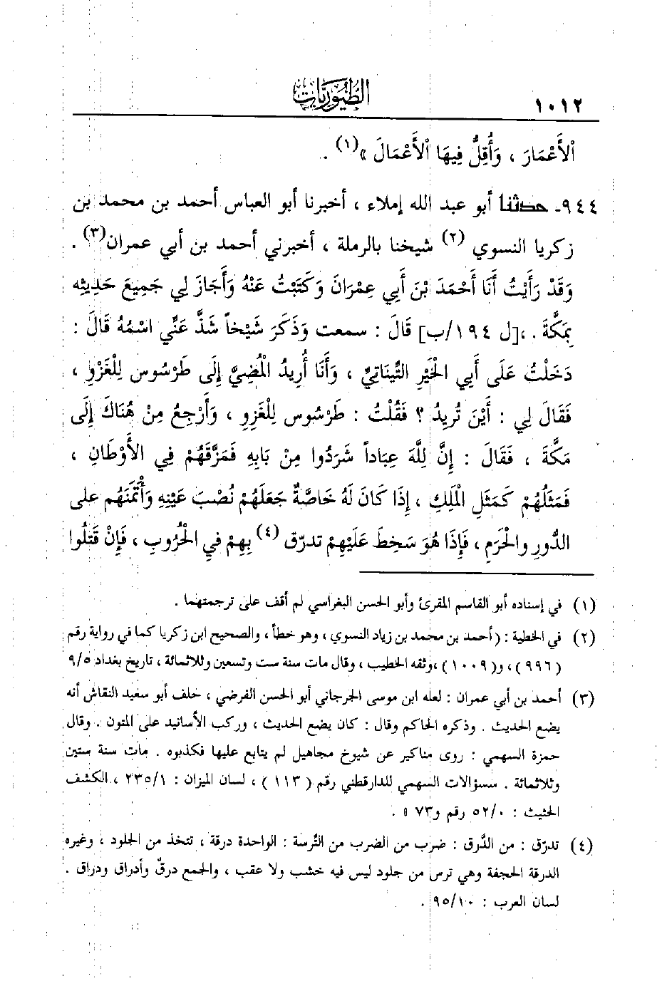 شيخنا بالرملة، أخبرني أحمد ابن أبي عمران (¬3) ـ وَقَدْ رَأَيْتُ أَنَا أَحْمَدَ بْنَ أَبِي عِمْرَانَ وَكَتَبْتُ عَنْهُ وَأَجَازَ لِي جَمِيعَ حَدِيثِه بِمَكَّةَ ـ، [ل 194/ب] قَالَ: سَمِعْتُ وَذَكَرَ شَيْخاً شَذَّ عَنِّي اسْمُهُ قَالَ: دَخَلْتُ عَلَى أَبِي الْخَيْرِ التِّينَاتِيِّ، وَأَنَا أُرِيدُ الْمُضِيَّ إِلَى طَرْسُوس لِلْغَزْوِ، فَقَالَ لِي: أَيْنَ تُريِدُ؟ فَقُلْتُ: طَرْسُوس لِلْغَزِوِ، وَأَرْجِعُ مِنْ هُنَاكَ إِلَى مَكَّةَ، فَقَالَ: إِنَّ لِلَّهَ عِبَاداً شَرَدُوا مِنْ بَابِهِ فَمَزَّقَهُمْ فِي الأَوْطَانِ، فَمَثَلُهُمْ كَمَثَلِ الْمَلِكِ، إِذَا كَانَ لَهُ خَاصَّةٌ جَعَلَهُمْ نُصْبَ عَيْنِهِ وَأْتَمَنَهُم على الدُّورِ والْحَرَمِ، فَإِذَا هُوَ سَخِطَ عَلَيْهِمْ تدرق (¬4) بِهِمْ فيِ الْحُرُوبِ، فَإِنْ قَتلُوا