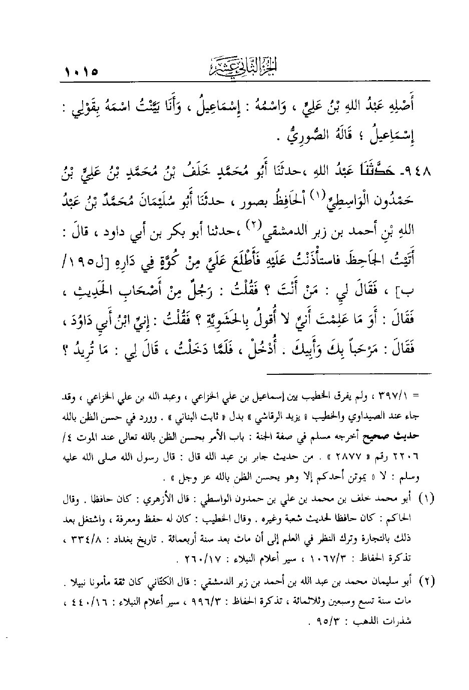 948 - حَدَّثَنَا عَبْدُ اللهِ، حدثَنَا أَبُو مُحَمَّدٍ خَلَفُ بْنُ مُحَمَّدٍ بْنُ عَلِيٍّ بْنُ حَمْدُون الْوَاسِطِيِّ (¬1) اْلحَافِظُ بِصُورَ، حدثَنَا أَبُو سُلَيْمَانَ مُحَمَّدٌ بْنُ عَبْدُ اللهِ بْنِ أحمد بن زَبْرٍ الدِّمَشْقِيُّ (¬2) ، حَدَّثَنَا أَبُو بَكْرِ بْنُ أَبِي دَاوُدَ، قالَ: أَتَيْتُ الجَاحِظَ فاستأْذَنْتُ عَلَيْهِ فَأَطْلَعَ عَلَيَّ مِنْ كُوَّةٍ فِي دَارِهِ [ل195/ب] ، فَقَالَ ليِ: مَنْ أَنْتَ؟ فَقُلْتُ: رَجُلٌ مِنْ أَصْحَابِ الَحَدِيثِ، فَقَالَ: أَوَ مَا عَلِمْتَ أَنيِّ لا أََُقولُ بِالحَشَوِيَّةِ؟ فَقُلْتُ: إِنيِّ ابْنُ أَبيِ دَاوُدَ، فَقَالَ: مَرْحَباً بِكَ وَأَبِيكَ. أُدْخُلْ، فَلَمَّا دَخَلْتُ، قَالَ لِي: مَا تُرِيدُ؟