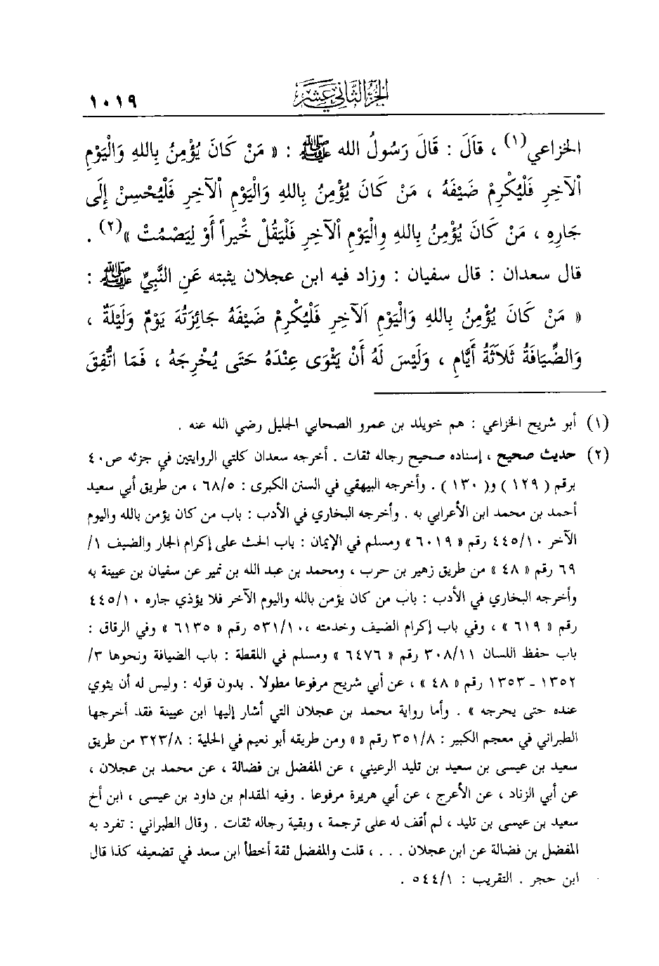وأخرجه البخاري في الأدب: باب مَنْ كَانَ يُؤْمِنُ بِاللَّهِ وَالْيَوْمِ الآخر 10/445 رقم ((6019)) ومسلم في الإيمان: باب الحث على إكرام الجار والضيف 1/69 رقم ((48)) من طريق زهير بن حرب، ومحمد بن عبد الله بن نمير عن سفيان بن عيينة به