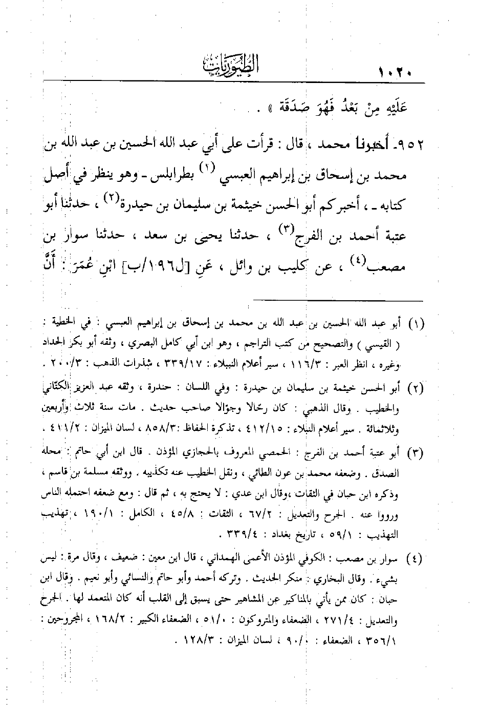 952 - أَخْبَرَنَا مُحَمَّدٌ، قَالَ: قَرَأْتُ عَلَى أَبِي عَبْدِ اللَّهِ الْحُسَيْنِ بْنِ عبد الله بن محمد