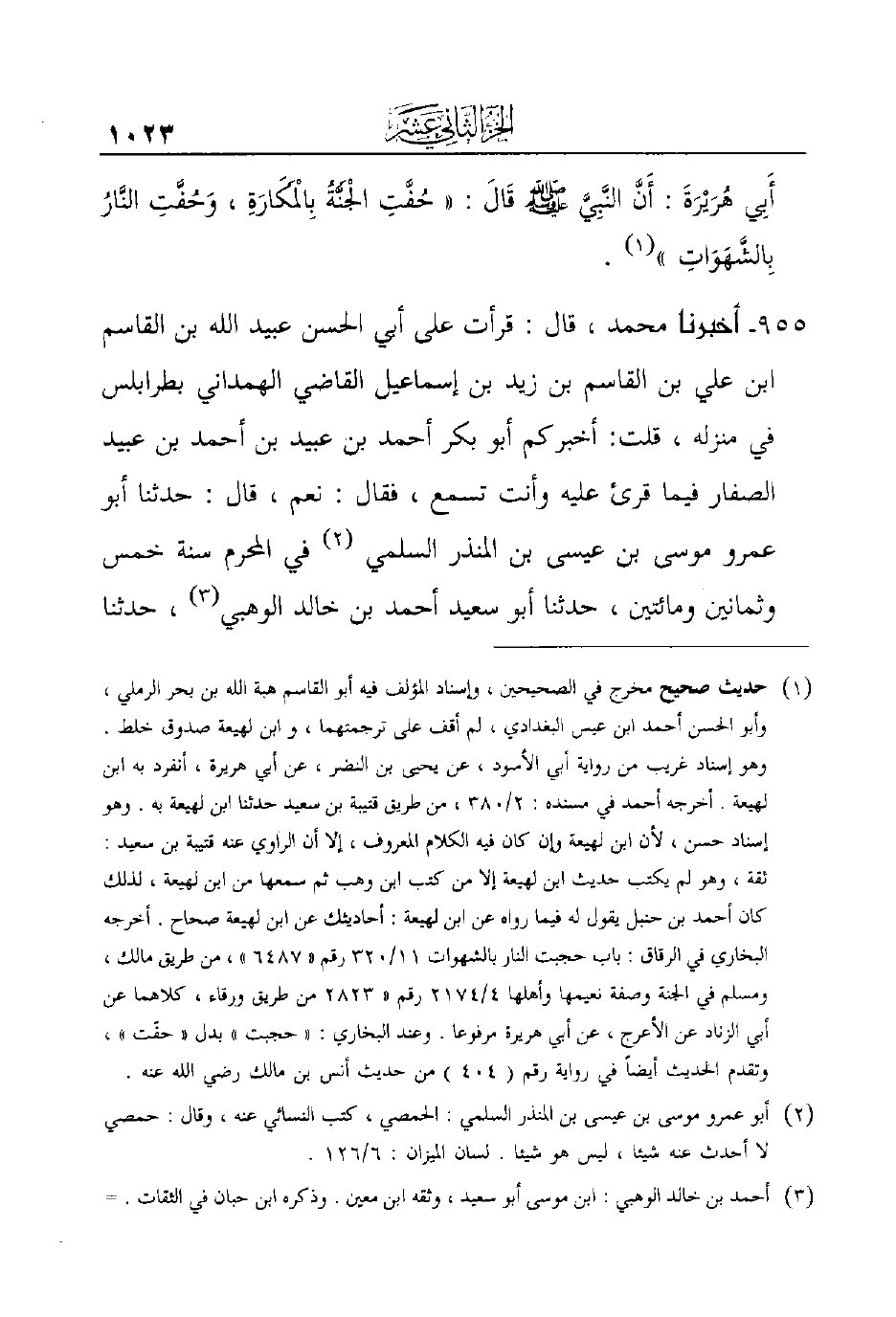 955 - أَخْبَرَنَا مُحَمَّدٌ، قَالَ: قَرَأْتُ عَلَى أَبِي الْحَسَنِ عُبَيْدِ اللَّهِ بْنِ القاسم بن علي ابن القاسم ابن زَيْدِ بْنِ إِسْمَاعِيلَ الْقَاضِي الْهَمْدَانِيِّ بِطَرَابُلُسَ فِي مَنْزِلِهِ، قُلْتُ: أَخْبَرَكُمْ أبو بكر أحمد ابن عبيد ابن أحمد ابن عُبَيْدٍ الصَّفَّارُ فِيمَا قُرِئَ عَلَيْهِ وَأَنْتَ تَسْمَعُ، فَقَالَ: نَعَمْ، قَالَ: حَدَّثَنَا أَبُو عَمْرٍو مُوسَى بْنُ عِيسَى بْنِ الْمُنْذِرِ السُّلَمِيُّ (¬2) فِي الْمُحَرَّمِ سَنَةَ خَمْسٍ وَثَمَانِينَ وَمِائَتَيْنِ، حَدَّثَنَا أَبُو سَعِيدٍ أَحْمَدُ ابن خالد الوهبي (¬3) ، حَدَّثَنَا