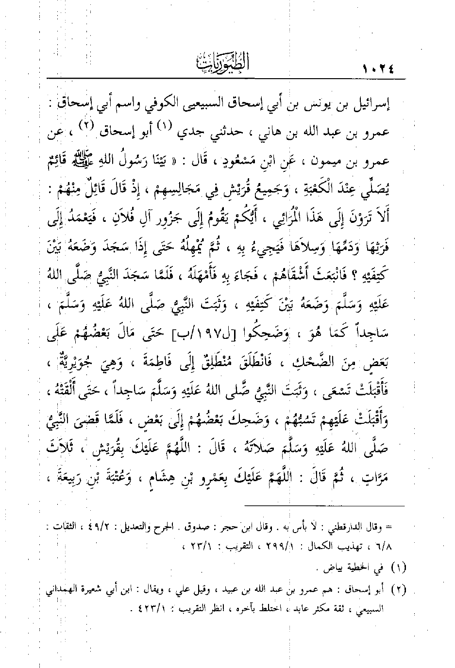 ابن مَيْمُونٍ، عَنِ ابْنِ مَسْعُودٍ، قَال: ((بَيْنَا رَسُولُ اللهِ - صَلَّى اللَّهُ عَلَيْهِ وَسَلَّمَ - قَائِمٌ يُصَلِّي عِنْدَ الْكَعْبَةِ، وَجَمِيعُ قُرَيْشِ فِي مَجَالِسِهِمْ، إِذْ قَالَ قَائِلٌ مِنْهُمْ: أَلاَ تَرَوْنَ إِلَى هَذَا الْمُرَائِي، أَيُّكُمْ يَقُومُ إِلَى جَزُوِر آلِ فُلاَنِ، فَيَعْمَدُ إِلَى فَرَثِهَا وَدَمِّهَا وَسِلاَهَا فَيَجِيءُ بِهِ، ثُمَّ يُمْهِلُهُ حَتَى إِذَا سَجَدَ وَضَعَهُ بَيْنَ كَتِفَيْهِ؟ فَانْبَعَثَ أَشْقَاهُمْ، فَجَاءَ بِهِ فَأَمْهَلَهُ، فَلَمَّا سَجَدَ النَّبِيُّ صَلَّى اللهُ عَلَيْهِ وَسَلَّمَ وَضَعَهُ بَيْنَ كَتِفَيْهِ، وَثَبَتَ النَّبِيُّ صَلَّى اللهُ عَلَيْهِ وَسَلَّمَ، سَاجِداً كَمَا هُوَ، وَضَحِكُوا [ل197/ب] حَتَى مَالَ بَعْضُهُمْ عَلَى بَعَضٍ مِنَ الضَّحْكِ، فَانْطَلَقَ مُنْطَلِقٌ إِلَى فَاطِمَةَ، وَهِيَ جُوَيْرِيَّةٌ، فَأَقْبَلَتْ تَسْعَى، وَثَبَتَ النَّبِيُّ َصَّلى اللهُ عَلَيْهِ وَسَلَّمَ سَاجِداً، حَتَى أَلْقَتْهُ، وَأَقْبَلَتْ عَلَيْهِمْ تَسُبُّهُمْ، وَضَحِكَ بَعْضُهُمْ إِلَى َبعْضٍ، فَلَمَّا قَضىَ النَّبِيُّ صَلَّى اللهُ عَلَيْهِ وَسَلَّمَ صَلاَتَهُ، قَالَ: اللَّهُمَّ عَلَيْكَ بِقُرَيْشٍ، ثَلاَثَ مَرَّاتٍ، ثُمَّ قَالَ: اللَّهَمَّ عَلَيْكَ بِعَمْرٍو بْنِ هِشَامٍ، وَعُتْبَةَ بْنِ رَبِيعَةَ،