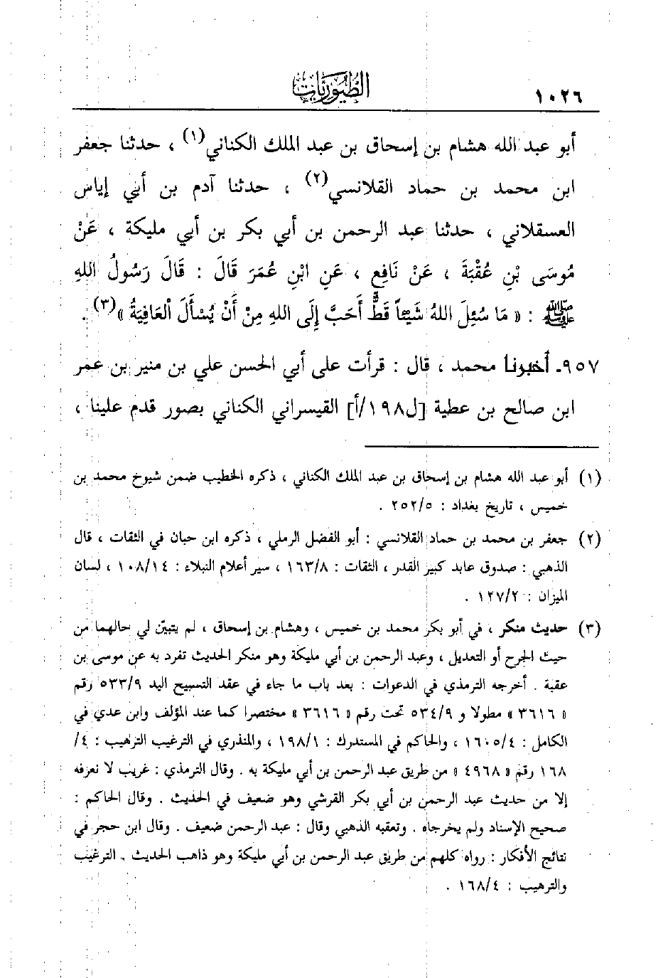 ، حدثنا جعفر ابن مُحَمَّدِ بْنِ حَمَّادٍ الْقَلانِسِيُّ (¬2) ، حَدَّثَنَا آدَمُ بْنُ أَبِي إِيَاسٍ الْعَسْقَلانِيُّ، حَدَّثَنَا عَبْدُ الرَّحْمَنِ بْنُ أَبِي بَكْرِ بْنِ أَبِي مُلَيْكَةَ، َعنْ مُوسَى ابْنِ عُقْبَةَ، عَنْ نَافِعٍ، عَنِ ابْنِ عُمَرَ قَالَ: قَالَ رَسُولُ اللهِ - صَلَّى اللَّهُ عَلَيْهِ وَسَلَّمَ -: ((مَا سُئِلَ اللهُ شَيْئاً قَطٌّ أَحَبَّ إِلَى اللهِ مِنْ أَنْ يُسْأَلَ اْلعَافِيَةُ)) (¬3) .