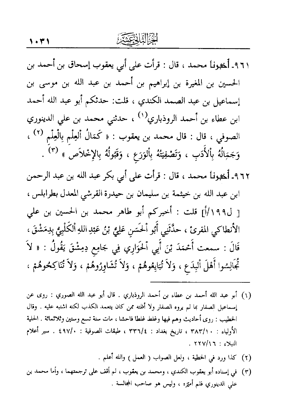961 - أَخْبَرَنَا مُحَمَّدٌ، قَالَ: قَرَأْتُ عَلَى أبي يعقوب إسحاق بن أحمد بن الحسين ابن المغيرة ابن إبراهيم بن أحمد بن عبد الله بن موسى بن إسماعيل بن عبد الصمد الكندي، قلت: حدثكم أبو عبد الله أحمد بن عطاء بن أحمد الروذباري (¬1) ، حدثني محمد بن علي الدينوري الصوفي، قال: قال محمد بن يعقوب: ((كَمَالُ اْلعِلْمِ بِالْعِلْمِ (¬2) ، َوجَمَالُهُ بِاْلأَدَبِ، وَتَصْفِيَتُهُ بِاْلوَرَعِ، وَقَبُولُهُ بِالإِخْلاَص)) (¬3) .