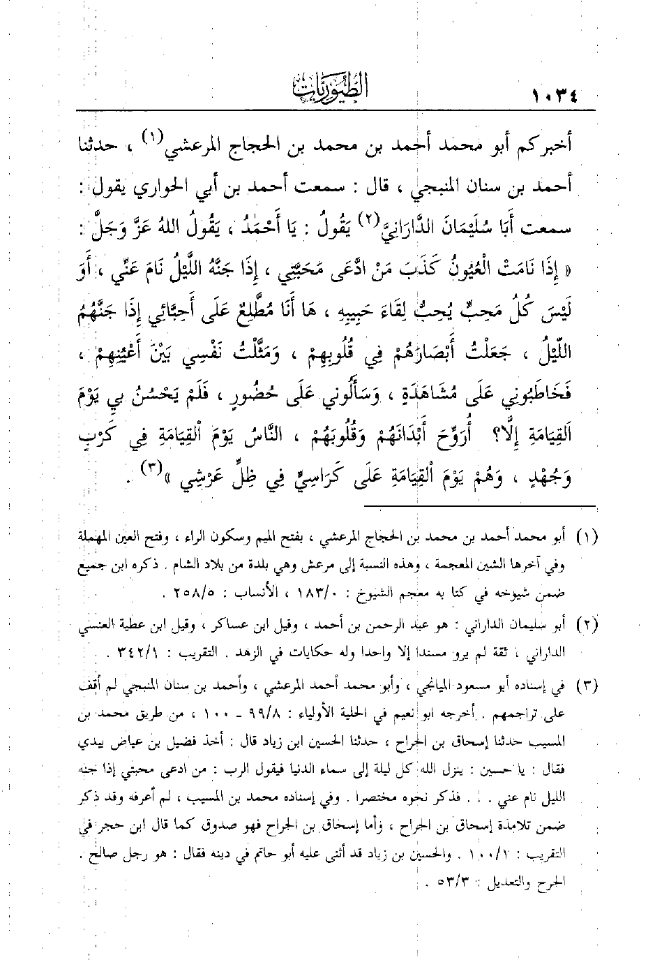 يَقُولُ: يَا أَحْمَدُ، يَقُولُ اللهُ عَزَّ وَجَلَّ: ((إِذَا نَامَتْ الْعُيُونُ كَذَبَ مَنْ ادَّعَى مَحَبَّتِي، إِذَا جَنَّهُ اللَّيْلُ نَامَ عَنِّي، أَوَ لَيْسَ كُلُ مَحِبٍّ يُحِبُّ لِقَاءَ حَبِيبِهِ، هَا أَنَا مُطَّلِعٌ عَلَى أَحِبَّائِي إِذَا جَنَّهُمُ اللّيْلُ، جَعَلْتُ أَبْصَارَهُمْ فِي قُلُوبِهِمْ، وَمَثَّلْتُ نَفْسِي بَيْنَ أَعْيُنِهِمْ، فَخَاطَبُونِي عَلَى مُشَاهَدَةٍ، وَسَأَلُوني عَلَى حُضُورٍ، فَلَمْ يَحْسُنُ بيِ يَوْمَ اَلقِيَامَةِ إِلا َّ أُرَوِّحَ أَبْدَانَهُمْ وَقُلُوبَهُمْ، النَّاسُ يَوْمَ اْلقِيَامَةِ فِي كَرْبٍ وَجُهْدٍ، وَهُمْ يَوْمَ اْلقِيَامَةِ عَلَى كَرَاسِيٍّ فِي ظِلِّ عَرْشِي)) (¬3) .