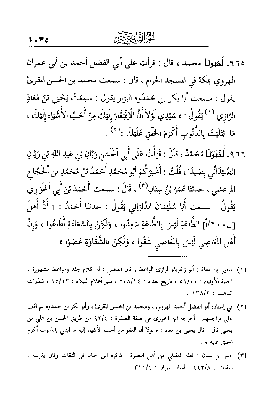 965 - أَخْبَرَنَا مُحَمَّدٌ، قَالَ: قَرَأْتُ عَلَى أبي الفضل أحمد بن أبي عمران الهروي بمكة في المسجد الحرام، قال: سمعت محمد بن الحسن المقرئ يقول: سمعت أبا بكر بن حَمْدُوه البزار يقول: َسمِعْتُ يَحْيَى بْنَ مُعَاذٍ الرَّازِي َّ (¬1) َيقُولُ: ((َسيِّدِي لَوْلاَ أَنَّ اْلاِفْتِقَارَ إِلَيْكَ مِنْ أَحَبِّ الأَشْيَاِء إِلَيْكَ، مَا ابْتَلَيْتَ بِالذُّنُوبِ أَكْرَمَ الخَلْقِ عَلَيْكَ)) (¬2) .