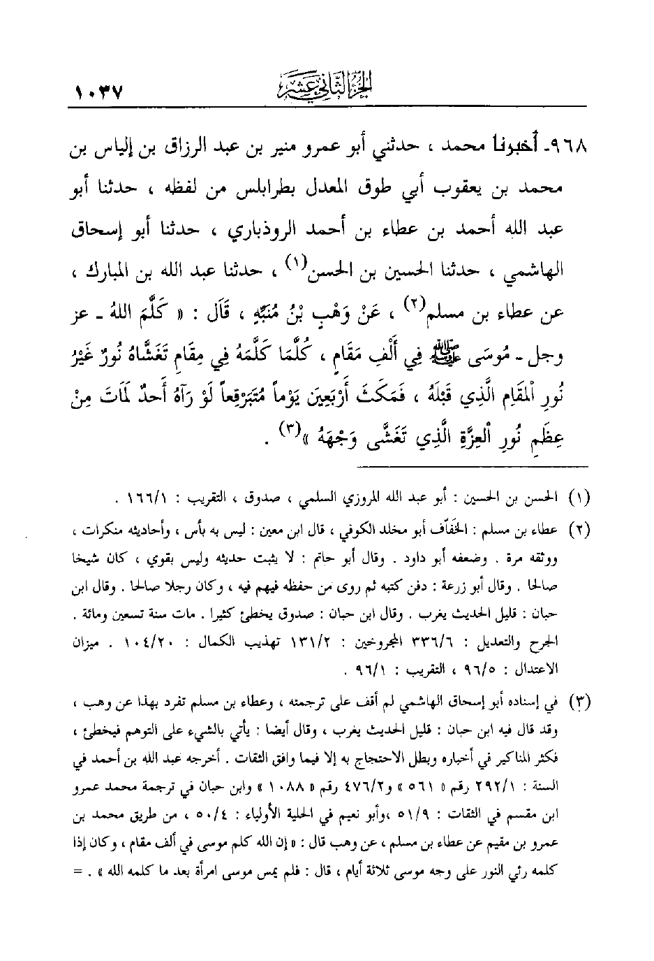 ابن يعقوب أبي طوق المعدل بطرابلس من لفظه، حدثنا أبو عبد الله أحمد بن عطاء بن أحمد الروذباري، حدثنا أبو إسحاق الهاشمي، حدثنا الحسين بن الحسن (¬1) ، حدثنا عبد الله ابن المبارك، عن عطاء بن مسلم (¬2) ، عَنْ وَهْبٍ بْنُ مُنَبِّهٍ، قَاَل: ((كَلَّمَ اللهُ عز وجل مُوسَى صَلَّى اللهُِ عَلَيْهِ وَسَلَّمَ فِي أَلْفِ مَقَامٍ، كُلَّمَا كَلَّمَهُ فِي مِقَامِ تَغَشَّاهُ نُورٌ غَيْرُ نُورِ اْلمَقَاِم الَّذِي قَبْلَهُ، فَمَكَثَ أَرْبَعِيَن يَوْمٌاً مُتَبَرْقِعاً لَوْ رَآهُ أَحدٌ لَمَاتَ مِنْ عِظَمِ نُورِ اْلعِزَّةِ الَّذِي تَغَشَّى وَجْهَهُ)) (¬3)
