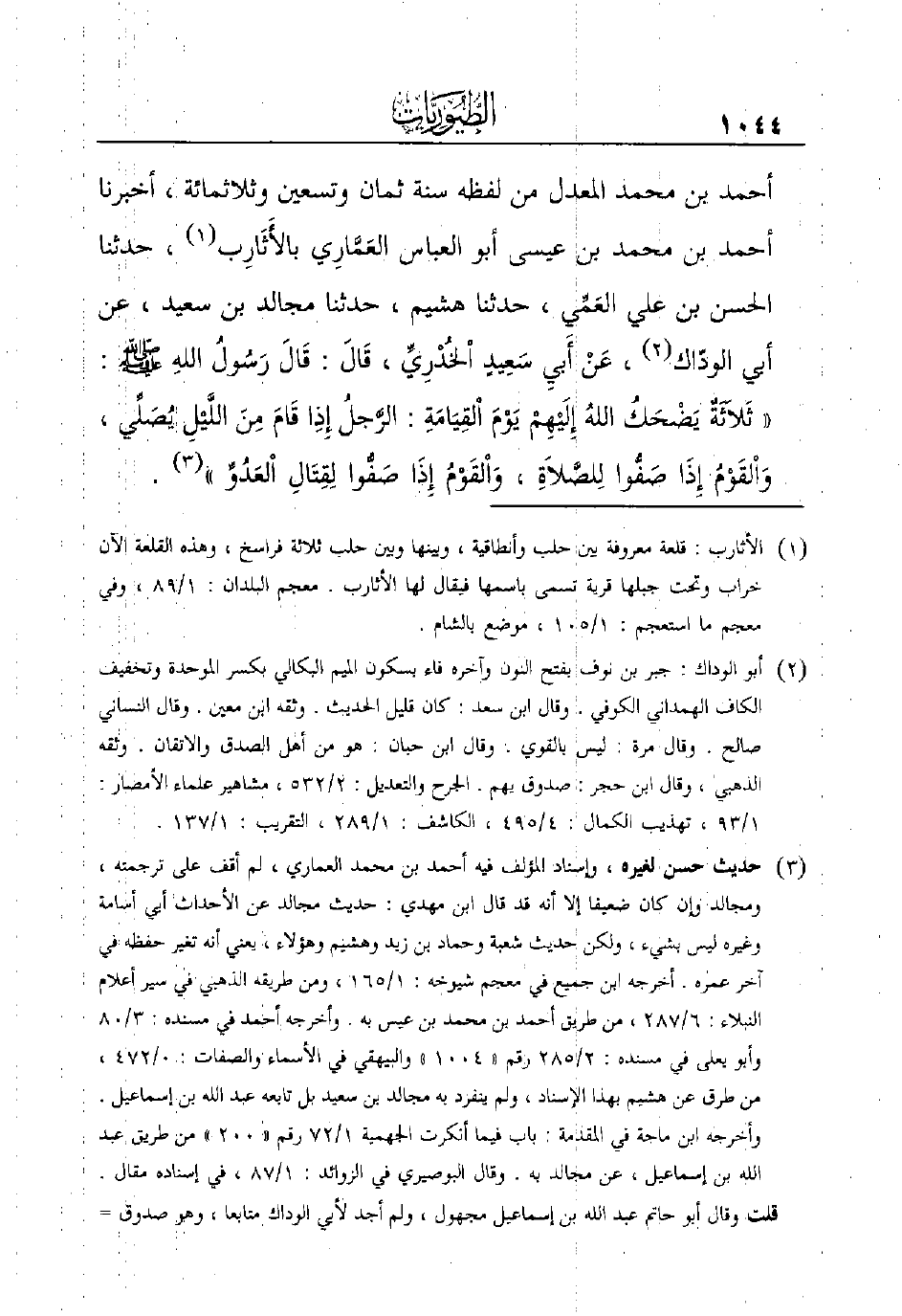أحمد ابن مُحَمَّدٍ الْمُعَدَّلُ مِنْ لَفْظِهِ سَنَةَ ثمان وتسعين وثلاثمائة، أَخْبَرَنَا أَحْمَدُ بْنُ مُحَمَّدِ بْنِ عِيسَى أَبُو الْعَبَّاسِ العَماَّرِي بالأَثَارِب (¬1) ، حَدَّثَنَا الْحَسَنُ بْنُ عَلِيٍّ العَمِّي، حَدَّثَنَا هُشَيْمٌ، حَدَّثَنَا مُجَالِدُ بْنُ سَعِيدٍ، عَنْ أَبِي الْوَدَّاكِ (¬2) ، عَنْ أَبيِ سَعِيدٍ اْلخُدْرِيِّ، قَالَ: قَالَ َرُسولُ اللهِ - صَلَّى اللَّهُ عَلَيْهِ وَسَلَّمَ -: ((ثَلاَثَةٌ يَضْحَكُ اللهُ إِلَيْهِمْ يَوْمَ اْلقِيَامَةِ: الرَّجِلُ إِذِا قَامَ مِنَ اللَّيْلِ يُصَلِّي، وَاْلقَوْمُ إِذَا صَفُّوا لِلصَّلاَةِ، وَاْلقَوْمُ إِذَا صَفُّوا لِقِتَالِ اْلعَدُوِّ)) (¬3)
