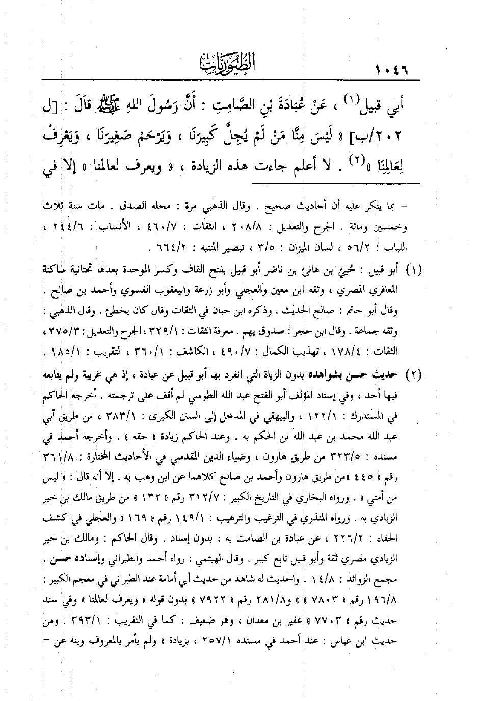 ، عَنْ عُبَادَةَ بْنِ الصَّامِتِ: أَنَّ رَسُولَ اللهِ - صَلَّى اللَّهُ عَلَيْهِ وسلم - قاَلَ: [ل 202/ب] ((لَيْسَ مِنَّا مَنْ لَمْ يُجِلَّ كَبِيرَنَا، وَيَرْحَمْ صَغِيرَنَا، وَيَعْرِفْ لِعَالِمِنَا)) (¬2) .