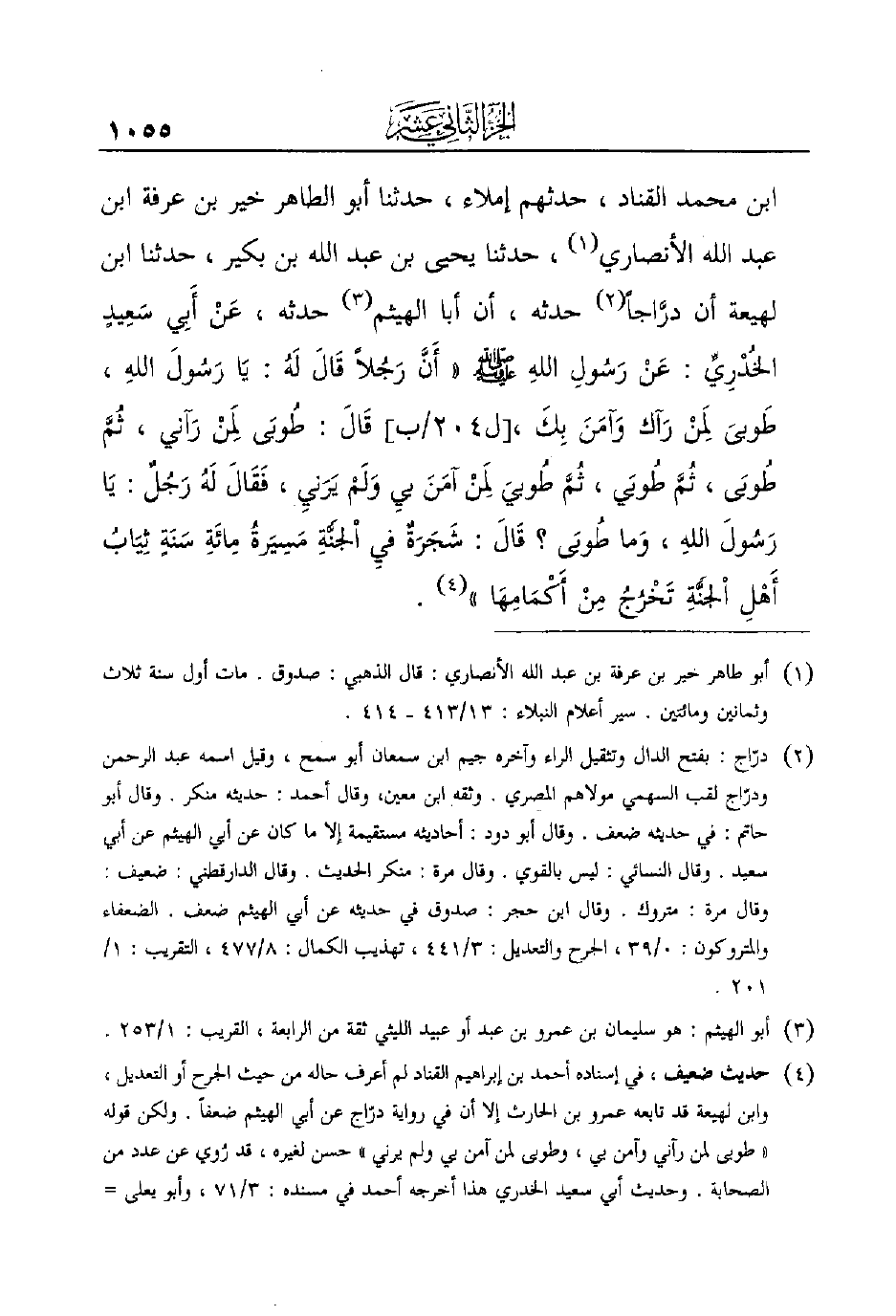 وأخرجه ابن حبان في صحيحه: 16/213 رقم ((7230)) و16/429 رقم ((7413)) والطبري في تفسيره: 13/149 من طريق عمرو بن الحارث، عن دراج به. لكن عند ابن حبان في رواية رقم ((7230)) مختصرا بدون قوله ((قال له رجل: وما طوبى.. . إلى آخره)) وورد في رواية رقم ((7413)) مختصرا ً-ب- ((قال لَهُ رَجُلٌ: يَا رَسُولَ اللَّهِ ما طوبى ... إلى آخره)) دون ذكر بداية الحديث. وقد تقدم الكلام على الإسناد.