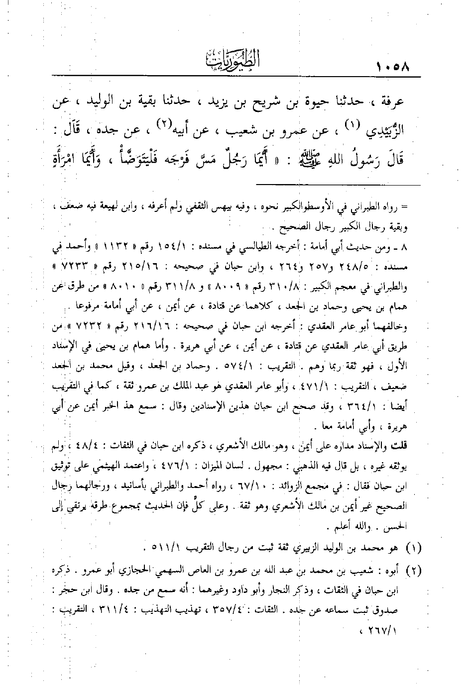 عَرَفَةَ، حَدَّثَنَا حَيْوَةُ بْنُ شُرَيْحِ بْنِ يَزِيدَ، حَدَّثَنَا بَقِيَّةُ بْنُ الْوَلِيدِ، عَنِ الزُّبَيْدِي (¬1) ، عَنْ عَمْرِو بْنِ شُعَيْبٍ، عَنْ أَبِيهِ (¬2) ، عَنْ جَدِّهِ، َقاَل: قَالَ رَسُولُ اللهِ - صَلَّى اللَّهُ عَلَيْهِ وَسَلَّمَ -: ((أَيُّمَا رَجُلٌ مَسَّ فَرْجَه فَلْيَتَوَضَّأْ، وَأَيُّمَا امْرَأَةٍ