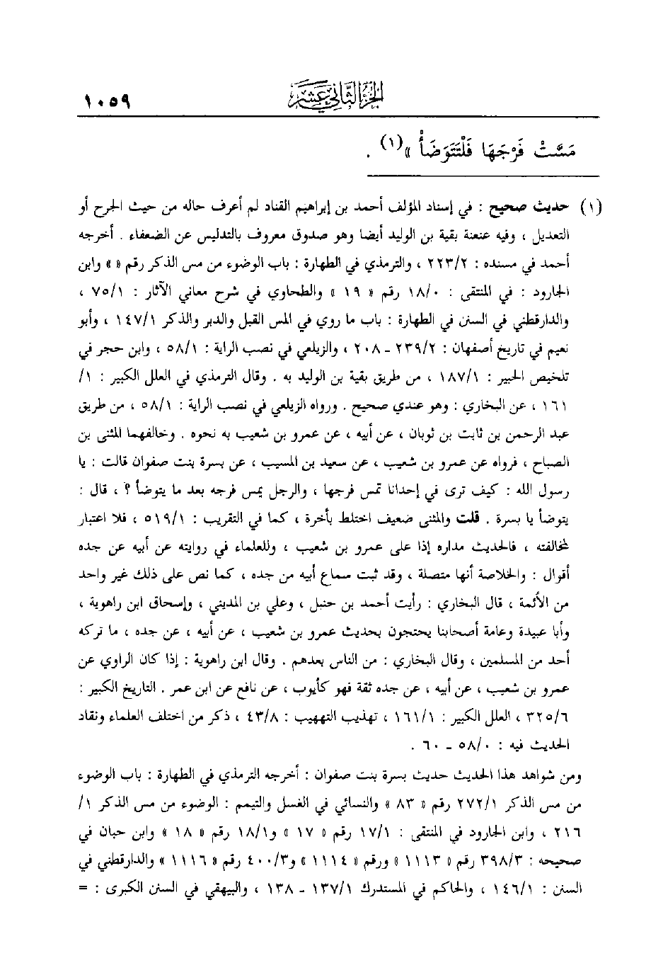 أخرجه أحمد في مسنده: 2/223، والترمذي في الطهارة: باب الوضوء من مس الذكر رقم (()) وابن الجارود: في المنتقى: 0/18 رقم ((19)) والطحاوي في شرح معاني الآثار: 1/75، والدارقطني في السنن في الطهارة: باب ما روي في المس القبل والدبر والذكر 1/147، وأبو نعيم في تاريخ أصفهان: 2/239- 208، والزيلعي في نصب الراية: 1/58، وابن حجر في تلخيص الحبير: 1/187، من طريق بقية بن الوليد به.