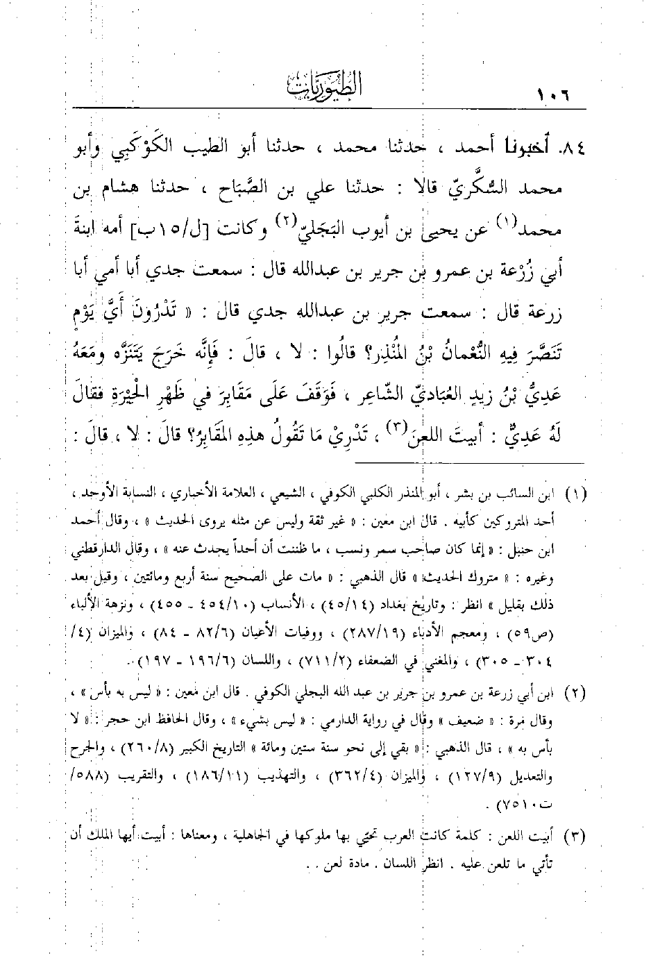 وكانت [ل/15ب] أُمُّهُ ابنةَ أَبِي زُرْعة بْنِ عمرو بن جرير بن عبد الله قَالَ: سَمِعْتُ جَدِّي أَبَا أُمِّي أَبَا زُرْعَةَ قَالَ: سَمِعْتُ جَرِيرَ بن عبد الله جَدِّي قَالَ: ((تَدْرُونَ أَيَّ يَوْمٍ تَنَصَّرَ فِيهِ النُّعْمانُ بْنُ المُنْذِر؟ قالُوا: لا، قالَ: فَإِنَّه خَرَجَ يَتَنَزَّه ومَعَهُ عَدِيُّ بْنُ زيدٍ العُبَاديّ الشّاعِر، فَوَقَفَ عَلَى مَقَابِرَ فِي ظَهْرِ الْحِيْرَةِ فقالَ لَهُ عَدِيٌّ: أبيتَ اللعنَ (¬3) ، تَدْرِيْ مَا تَقُولُ هذِهِ المَقَابِرُ؟ قالَ: لا، قالَ: