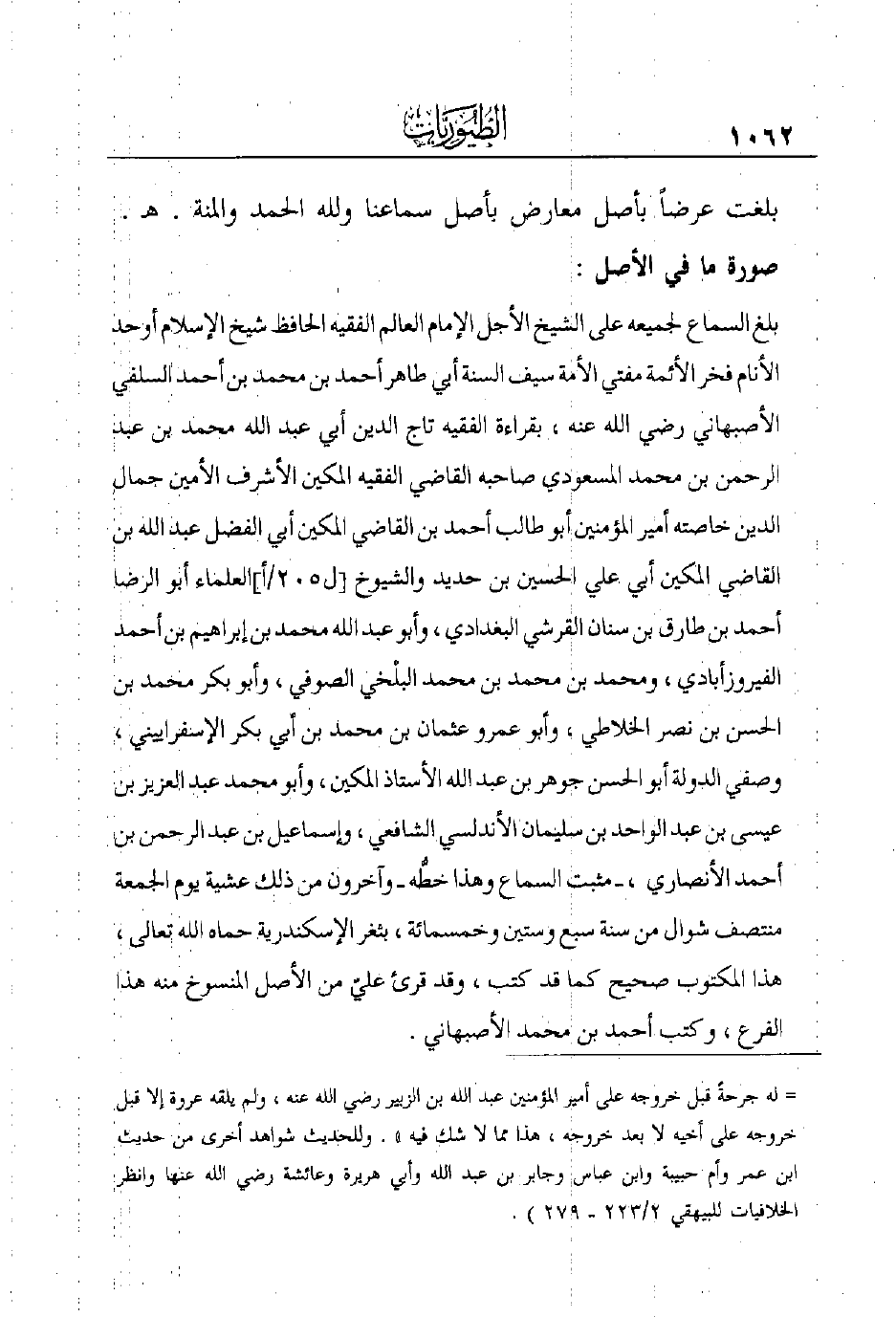 بلغ السماع لجميعه على الشيخ الأجل الأمام العالم الفقيه الحافظ شيخ الإسلام أوحد الأنام فخر الأئمة مفتي الأمة سيف السنة أبي طاهر أحمد بن محمد بن أحمد السلفي الأصبهاني رضي الله عنه، بقراءة الفقيه تاج الدين أبي عبد الله محمد بن عبد الرحمن بن محمد المسعودي صاحبه القاضي الفقيه المكين الأشرف الأمين جمال الدين خاصته أمير المؤمنين أبو طالب أحمد ابن القاضي المكين أبي الفضل عبد الله بن القاضي المكين أبي علي الحسين بن حديد والشيوخ [ل205/أ] العلماء أبو الرضا أحمد بن طارق بن سنان القرشي البغدادي، وأبو عبد الله محمد ابن إبراهيم بن أحمد الفيروزآبادي، ومحمد بن محمد بن محمد البلْخي الصوفي، وأبو بكر محمد ابن الحسن بن نصر الخلاطي، وأبو عمرو عثمان بن محمد بن أبي بكر الإسفراييني، وصفي الدولة أبو الحسن جوهر بن عبد الله الأستاذ المكين، وأبو محمد عبد العزيز بن عيسى بن عبد الواحد ابن سليمان الأندلسي الشافعي، وإسماعيل بن عبد الرحمن بن أحمد الأنصاري، - مثبت السماع وهذا خطُّه – وآخرون من ذلك عشية يَوْمِ الْجُمُعَةِ، مُنْتَصَفِ شَوَّالٍ مِنْ سنة سبع وستين وخمسمائة، بثغر الإسكندرية حماه الله تعالى، هذا المكتوب صحيح كما قد كتب، وقد قرئ عليّ من الأصل المنسوخ منه هذا الفرع، وكتب أحمد بن محمد الأصبهاني.