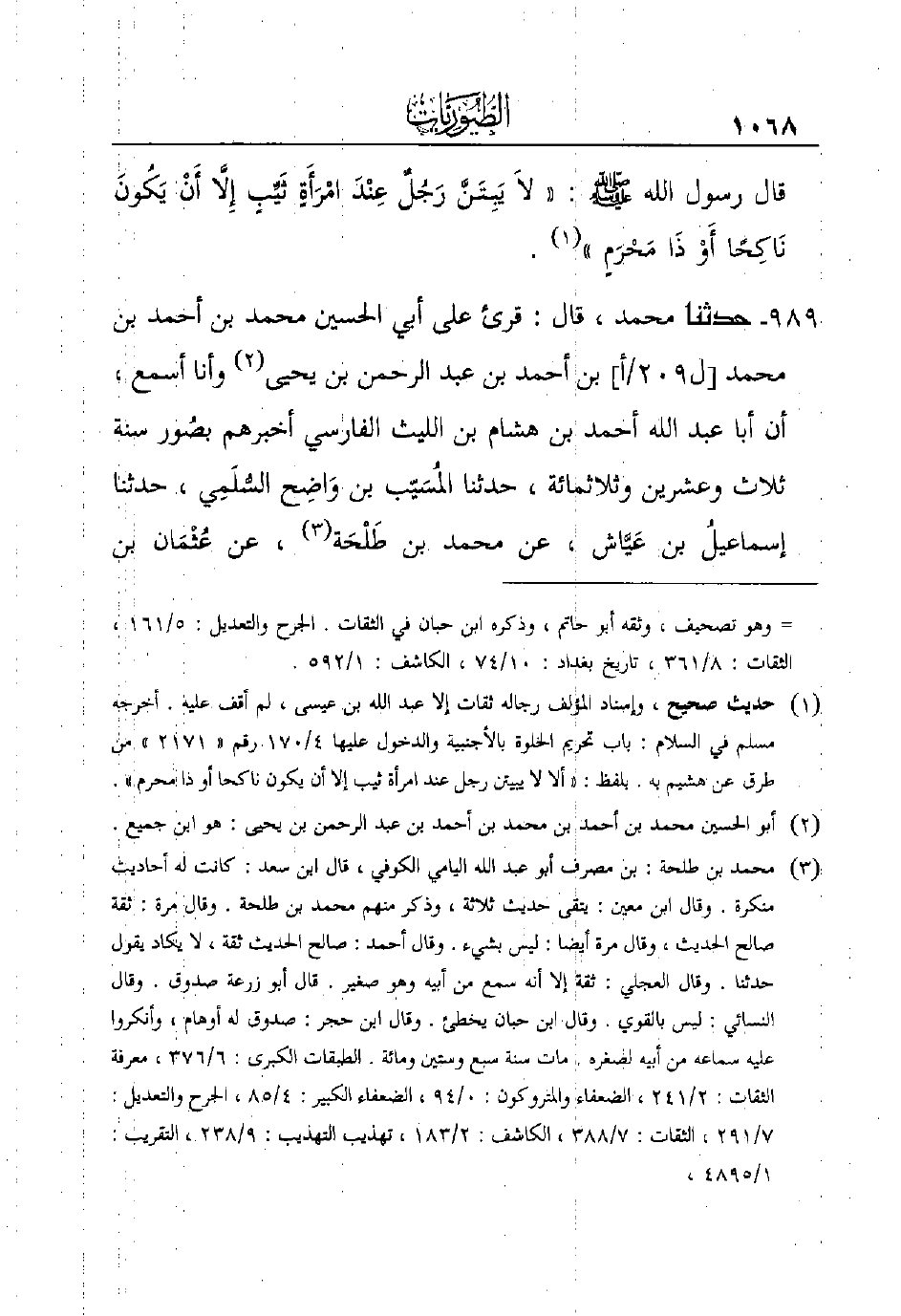 989 - حَدَّثَنَا مُحَمَّدٌ، قَالَ: قُرِئَ عَلَى أَبِي الْحُسَيْنِ مُحَمَّدِ بْنِ أحمد بن محمد [ل209/أ] ابن أَحْمَدُ بْنُ عَبْدِ الرَّحْمَنِ بْنِ يَحْيَى (¬2) وَأَنَا أَسْمَعُ، أَنَّ أَبَا عَبْدِ اللَّهِ أَحْمَدُ بْنُ هِشَامِ بْنِ اللَّيْثِ الْفَارِسِيَّ أَخْبَرَهُمْ بصُور سَنَةَ ثلاث وعشرين وثلاثمائة، حَدَّثَنَا المُسَيّب بْنُ وَاضِح السُّلَمِي، حَدَّثَنَا إسماعيلُ بْنُ عَيَّاش، عَنْ مُحَمَّدِ بْنِ طَلْحَة (¬3) ، عَنْ عُثْمَان ابن ي
