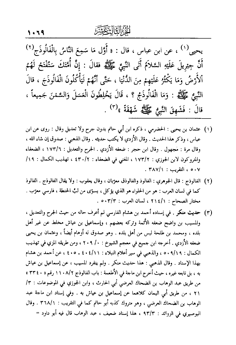 (¬1) عثمان بن يحيى: الحضرمي، ذكره ابن أبي حاتم بدون جرح ولا تعديل وقال: روى عن ابن عباس، وذكر هذا الحديث. وقال الأزدي لا يكتب حديثه. وقال الذهبي: صدوق إن شاء الله، وقال مرة: مجهول. وقال ابن حجر: ضعفه الأزدي. الجرح والتعديل: 6/173، الضعفاء والمتروكون لابن الجوزي: 2/173، المغني في الضعفاء: 2/430، تهذيب الكمال: 19/507، التقريب: 1/387.
