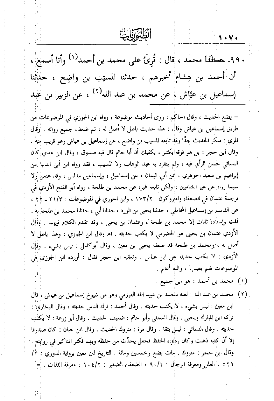 (¬2) محمد بن عبد الله: لعله مُحَمَّدِ بْنِ عُبَيْدِ اللَّهِ الْعَرْزَمِيُّ وهو من شيوخ إسماعيل بن عياش، قال ابن معين: ليس بشيء، لا يكتب حديثه. وقال أحمد: ترك الناس حديثه، وقال البخاري: تركه ابن المبارك ويحيى. وقال العجلي وأبو حاتم: ضعيف الحديث. وقال أبو زرعة: لا يكتب حديثه. وقال النسائي: ليس بثقة. وقال مرة: متروك الحديث. وقال ابن حبان: كان صدوقا إلا أنّ كتبه ذهبت وكان رديء الحفظ فجعل يحدِّث من حفظه ويهم فكثر المناكير في روايته. وقال ابن حجر: متروك. مات بضع وخمسين ومائة. التاريخ لبن معين برواية الدوري: 2/529، العلل ومعرفة الرجال: 1/90، الضعفاء الضغير: 2/104، معرفة الثقات: 2/247، الضعفاء والمتروكون: 0/92، الجرح والتعديل: 8/1 المجروحين: 2/246، الكاشف: 2/197، التقريب: 1/494.