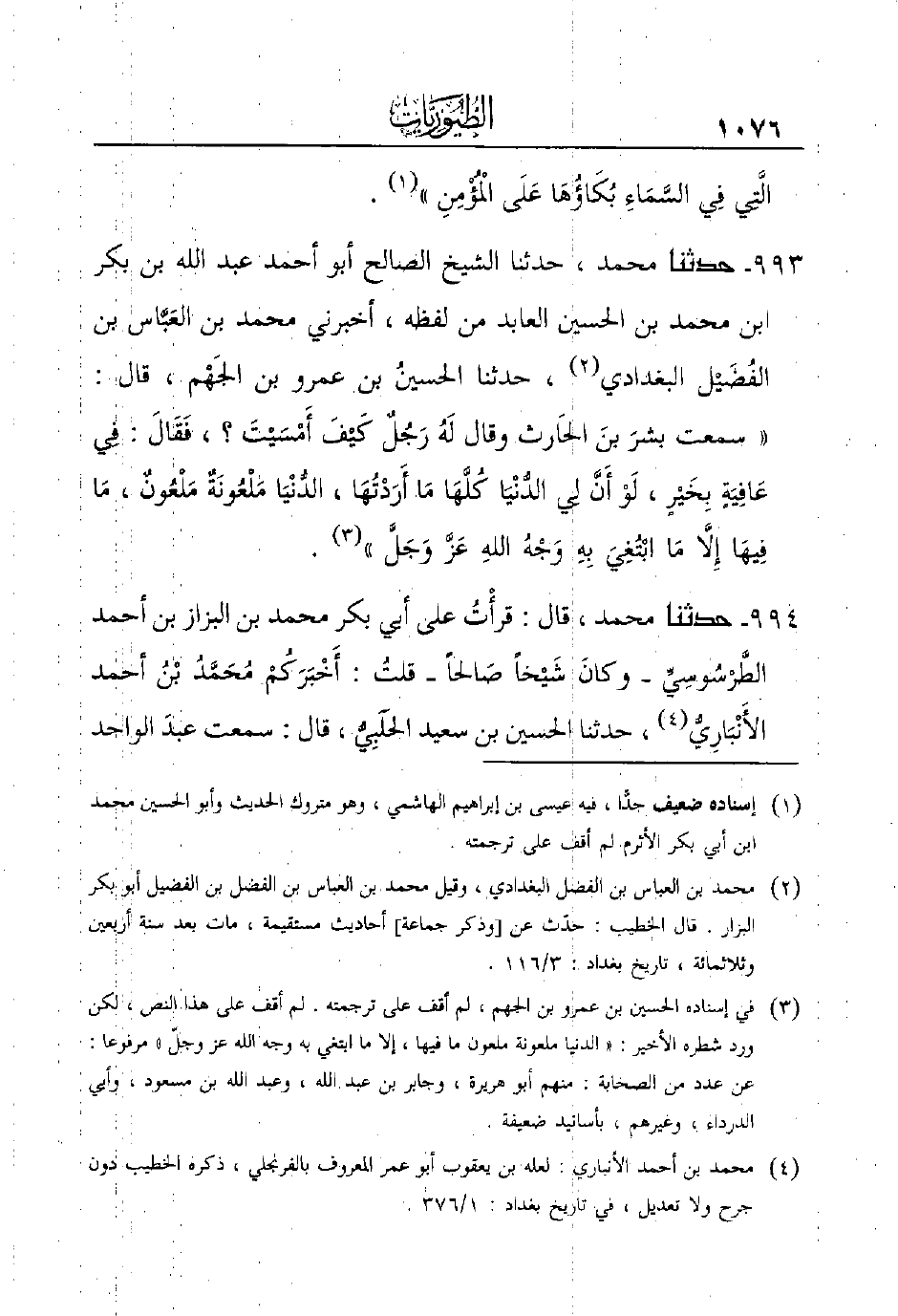 993 - حدثنا محمد، حدثنا الشيخ الصالح أبو أحمد عبد الله بن بكر بن محمد ابن الحسين العابد من لفظه، أخبرني محمد بن العَبَّاس بن الفُضَيْل البغدادي (¬2) ، حدثنا الحسينُ ابن عمرو بن الجَهْم، قال: ((سمعت بشرَ بنَ الحَارث وقال لَهُ رَجُلٌ كَيْفَ أَمْسَيْتَ؟، فَقَالَ: فِي عَافِيَةٍ بِخَيْرٍ، لَوْ أَنَّ لِي الدُّنْيَا كُلَّهَا مَا أَرَدْتُهَا، الدُّنْيَا مَلْعُونَةٌ مَلْعُونٌ، مَا فِيهَا إِلاَّ مَا ابْتُغِيَ بِهِ وَجْهُ اللهِ عَزَّ وَجَلَّ)) (¬3) .