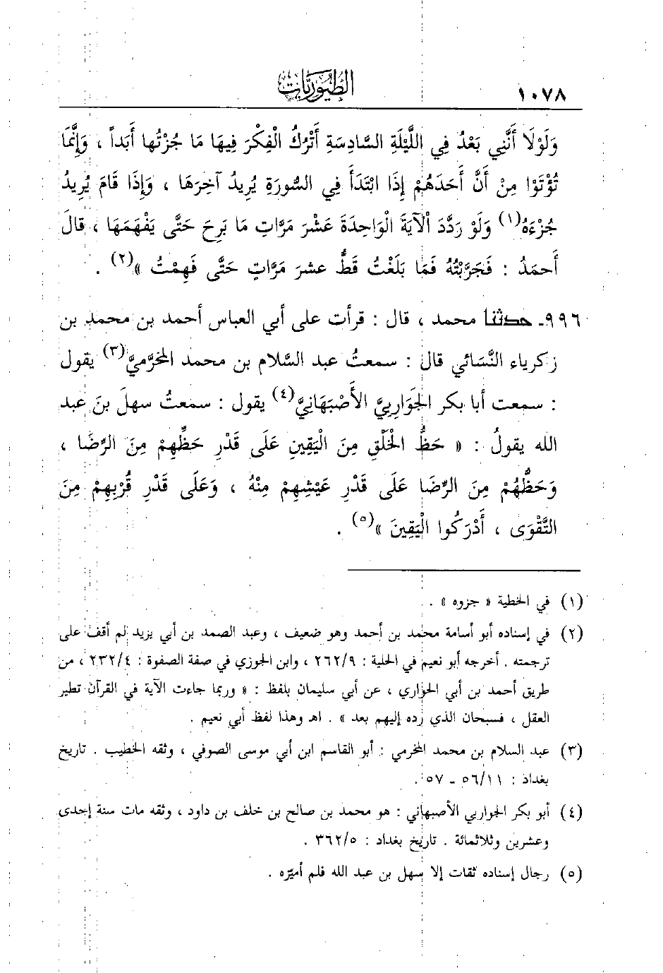 996 - حَدَّثَنَا مُحَمَّدٌ، قَالَ: قَرَأْتُ عَلَى أبي العباس أحمد بن محمد بن زكرياء النَّسَائي قال: سمعتُ عبد السَّلام بن محمد المخرَّميَّ (¬3) يقول: سمعت أبا بكر الجَوَارِبِيَّ الأَصْبَهَانِيَّ (¬4) يقول: سمعتُ سهلَ بنَ عبد الله يقولُ: ((حَظُّ الْخَلْقِ مِنَ الْيَقِينِ عَلَى قَدْرِ حَظِّهِمْ مِنَ الرِّضَا، وَحَظُّهُمْ مِنَ الرِّضَا عَلَى قَدْرِ عَيْشِهِمْ مِنْهُ، وَعَلَى قَدْرِ قُرْبِهِمْ مِنَ التَّقْوَى، أَدْرَكُوا الْيَقِينَ)) (¬5) .