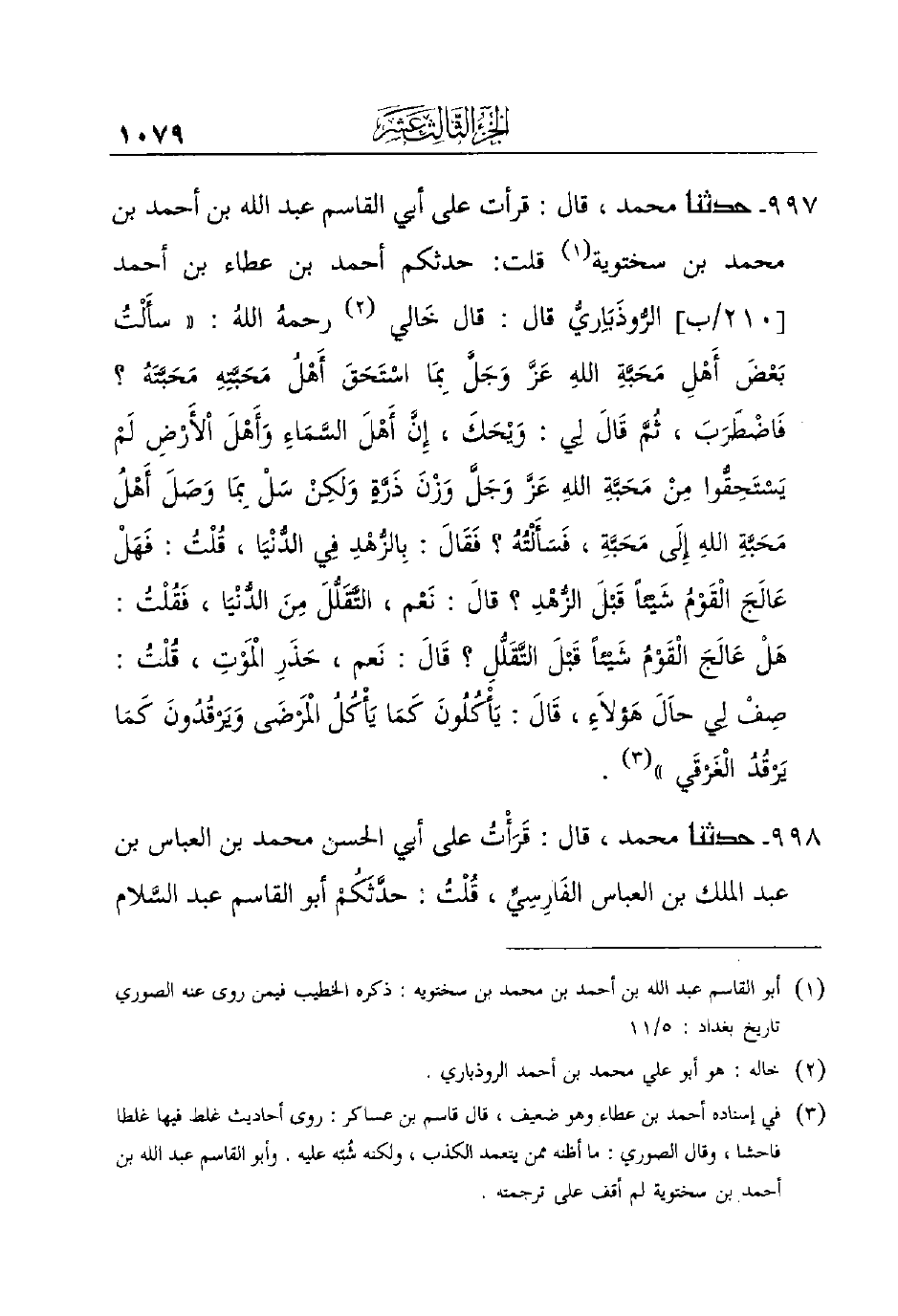 997 - حَدَّثَنَا مُحَمَّدٌ، قَالَ: قَرَأْتُ عَلَى أبي القاسم عبد الله بن أحمد بن محمد ابن سختوية (¬1) قلت: حدثكم أحمد بن عطاء ابن أحمد [210/ب] الرُّوذَبَاِريُّ قال: قال خَالي (¬2) رحمهُ اللهُ: ((سأَلْتُ بَعْضَ أَهْلِ مَحَبَّةِ اللهِ عَزَّ وَجَلَّ بِمَا اسْتَحَقَ أَهْلُ مَحَبَّتِهِ مَحَبَّتَهُ؟ فَاضْطَرَبَ، ثُمَّ قَالَ لِي: وَيْحَكَ، إِنَّ أَهْلَ السَّمَاءِ وَأَهْلَ اْلأَرْضِ لَمْ يَسْتَحِقُّوا مِنْ مَحَبَّةِ اللهِ عَزَّ وَجَلَّ وَزْنَ ذَرَّةٍ وَلَكِنْ سَلْ بِمَا وَصَلَ أَهْلُ مَحَبَّةِ اللهِ إِلَى مَحَبَّةِ، فَسَأَلْتُهُ؟ فَقَالَ: بِالزُّهْدِ فِي الدُّنْيَا، قُلْتُ: فَهَلْ عَالَجَ الْقَوْمُ شَيْئاً قَبْلَ الزُّهْدِ؟ قالَ: نَعْم، التَّقَلُّلَ مِنَ الدُّنْيَا، فَقُلْتُ: هَلْ عَالَجَ الْقَوْمُ شَيْئاً قَبْلَ التَّقَلُّلِ؟ قَالَ: نَعم، حَذَرِ الْمَوْتِ، قُلْتُ: صِفْ لِي حاَلَ هَؤلاَءِ، قَالَ: يَأْكُلُونَ كَمَا يَأْكُلُ الْمَرْضَى وَيَرْقُدُونَ كَمَا يَرْقُدُ الْغَرْقَي)) (¬3) .