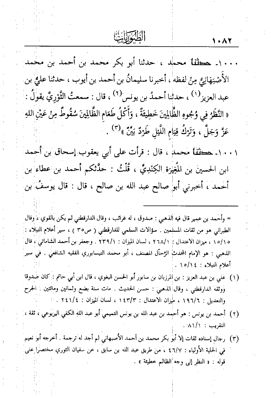1000 - حدثنا محمد، حدثنا أبو بكر محمد بن أحمد بن محمد الأَصْبَهَانِيُّ مِنْ لفظه، أخبرنا سليمانُ بن أحمد بن أيوب، حدثنا عليُّ بن عبد العزيز (¬1) ، حدثنا أحمدُ بن يونس (¬2) ، قال: سمعتُ الثَّوْرِيَّ يقولُ: ((النَّظَرُ فِي وُجُوهِ الظَّالِمِينَ خَطِيئَةٌ، وَأَكْلُ طَعَامِ الظَّالِمِينَ سُقُوطٌ مِنْ عَيْنِ اللهِ عَزَّ وَجَلَّ، وَتَرْكُ قِيَامِ اللَّيْلِ طَرْدٌ بَيِّنٌ)) (¬3) .