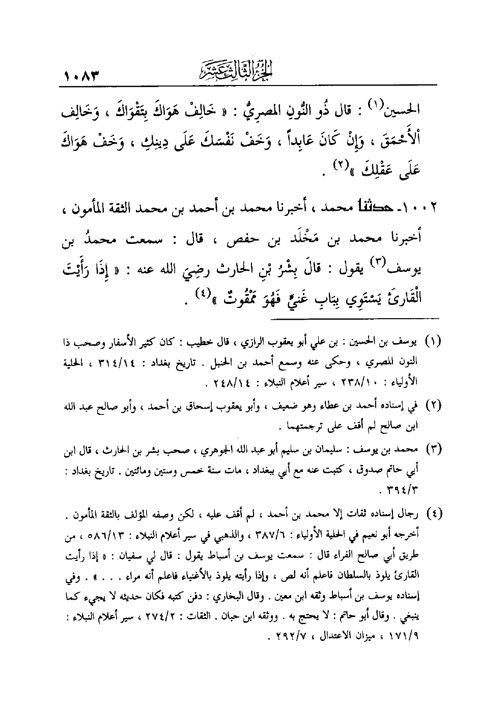 1002 - حَدَّثَنَا مُحَمَّدٌ، أَخْبَرَنَا مُحَمَّدُ بْنُ أحمد بن محمد الثقة المأمون، أخبرنا محمد ابن مَخْلَد بن حفص، قال: سمعت محمدُ بن يوسف (¬3) يقول: قالَ بِشْرُ بْنِ الحارث رضِيَ الله عنه: ((إِذَا رَأَيْتَ الْقَارئَ يَسْتَوِي بِبَابِ غَنٍّى فَهُوَ مَمْقُوتٌ)) (¬4)