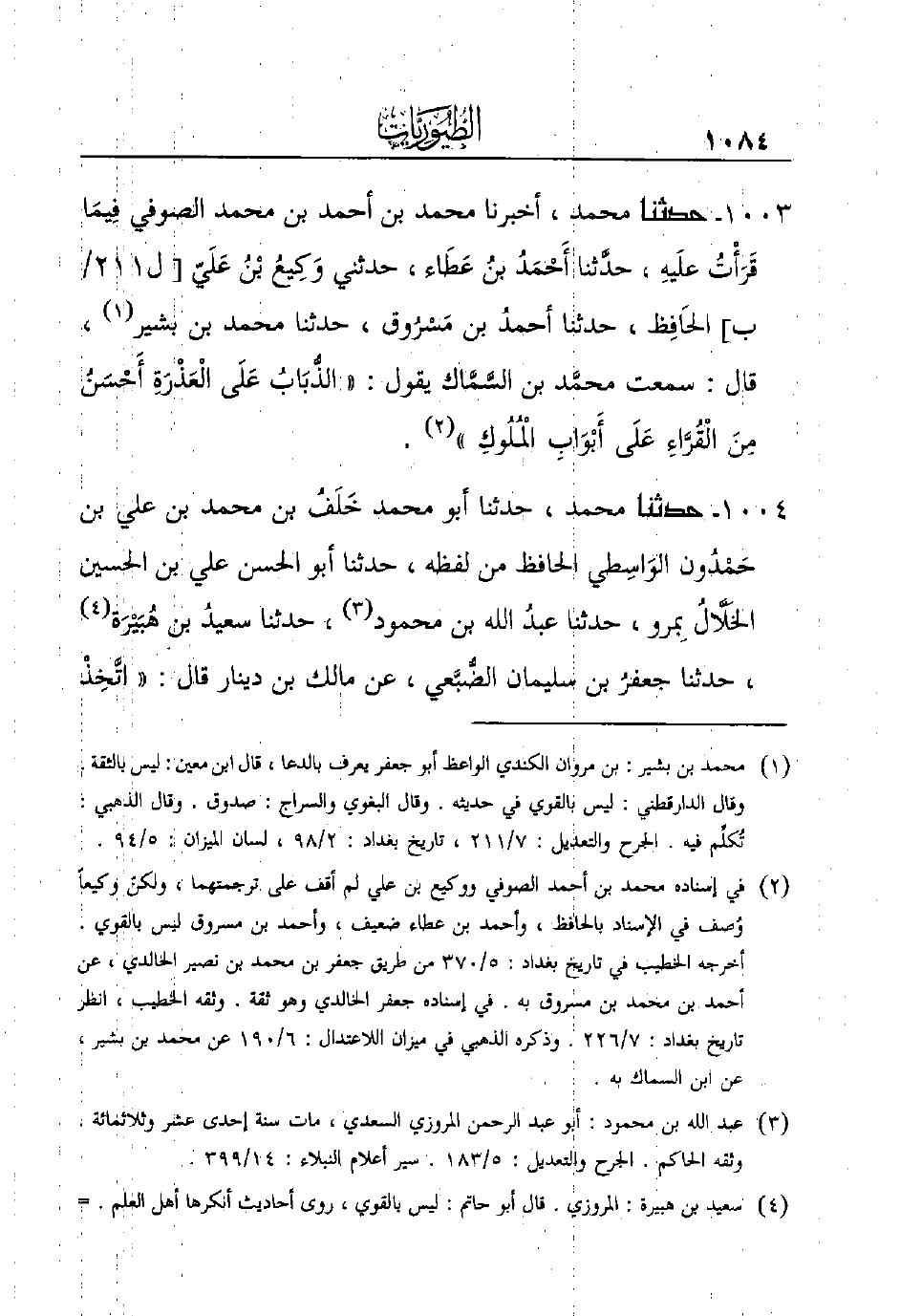 1003 - حَدَّثَنَا مُحَمَّدٌ، أَخْبَرَنَا مُحَمَّدُ بْنُ أحمد بن محمد الصوفي فِيمَا قَرَأْتُ علَيهِ، حدَّثنا أَحْمَدُ بنُ عَطَاء، حدثني وَكِيعُ بْنُ عَلَيّ [ل211/ب] الحَافِظ، حدثنا أحمدُ بن مَسْرُوق، حدثنا محمد بن بشير (¬1) ، قال: سمعت محمَّد بن السَّمَّاك يقول: ((الذُّبَابُ عَلَى الْعَذٍِِِِِِرَةِ أَحْسَنُ مِنَ الْقُرَّاءِ عَلَى أَبْوَابِ الْمُلُوكِ)) (¬2) .