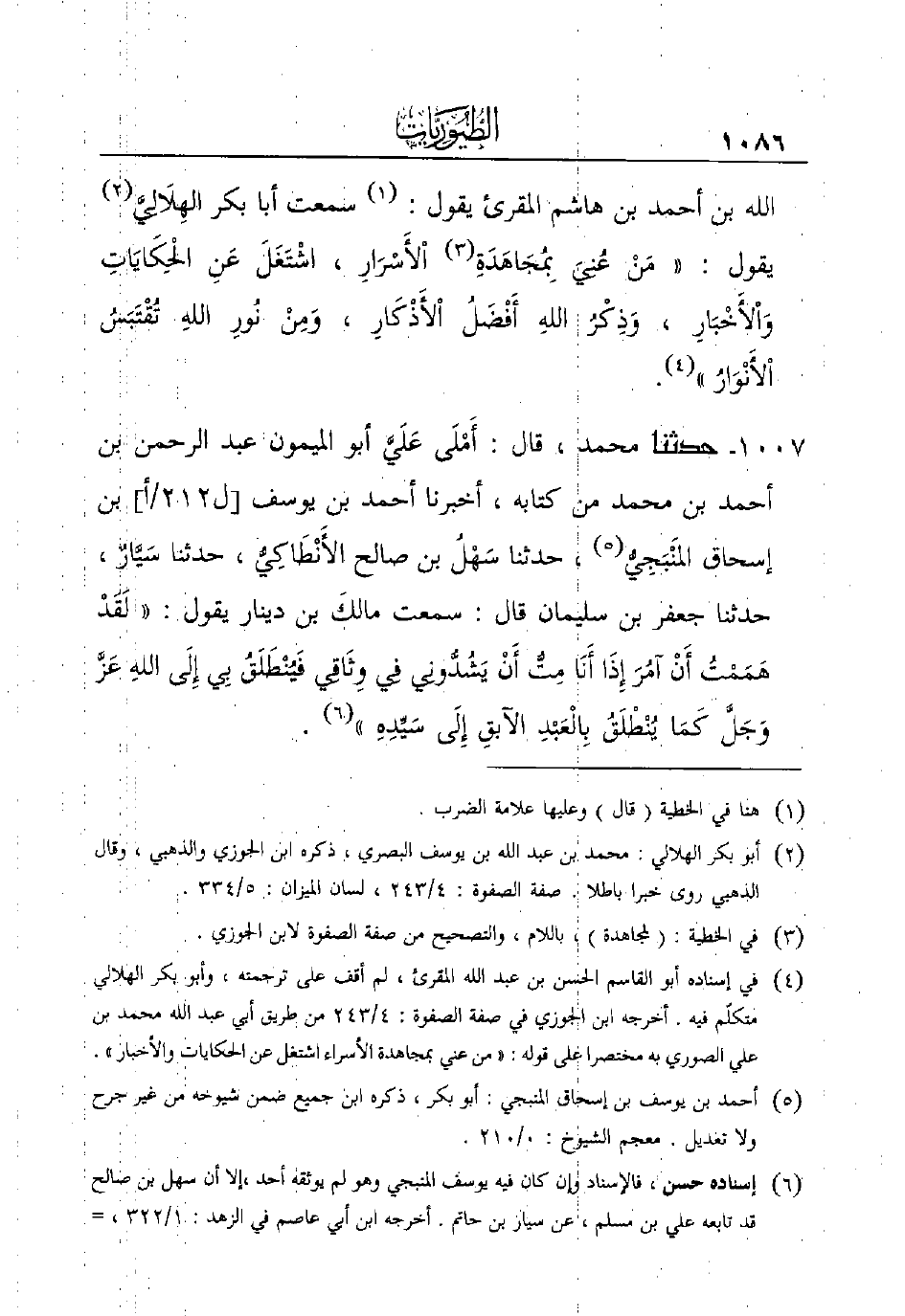 الله ابن أحمد ابن هاشم المقرئ يقول: (¬1) سمعت أبا بكر الهِلاَلِيَّ (¬2) يقول: ((مَنْ عُنِيَ بِمُجَاهَدَةِ (¬3) اْلأَسْرَارِ، اشْتَغَلَ عَنِ الْحِكَايَاتِ وَاْلأَخْبَارِ، وَذِكْرُ اللهِ أَفْضَلُ اْلأَذْكَارِ، وَمِنْ نُورِ اللهِ تُقْتَبَسُ اْلأَنْوَارُ)) (¬4) .
