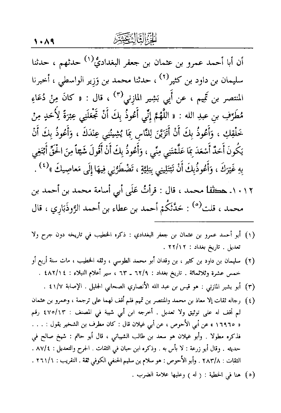 أن أبا أحمد عمرو ابن عثمان بن جعفر البغداديُّ (¬1) حدثهم، حدثنا سليمان بن داود بن كثير (¬2) ، حدثنا محمد ابن وَزِير الواسطي، أخبرنا المنتصر بن تَمِيم، عن أَبِي بَشِير المازِني (¬3) ، قال: ((كانَ مِنْ دُعَاءِ مُطَرِّفِ بنِ عبدِ الله: ((اللَّهُمَّ إِنِّي أَعُوذُ بِكَ أَنْ تَجْعَلَنِي عِبْرَةً ِلأَحَدٍ مِنْ خَلْقِكِ، وَأَعُوذُ بِكَ أَنْ أَتَزَيَّنَ لِلنَّاسِ بِمَا يُشِينُنِي عِنْدَكَ، وَأَعُوذُ بِكَ أَنْ يَكُونَ أَحَدٌ أَسْعَدَ بِمَا عَلَّمْتَنِي مِنِّي، وَأَعُوذُ بِكَ أَنْ أَقُولَ شَيْئاً مِنَ الْحَقِّ أَبْتَغِي بِهِ غَيْرَكَ، وَأَعُوذُبِكَ أَنْ تَبْتَلِينِي بِبَلِيَّةٍ، تَضْطَرُّنِي فِيهَا إِلَى مَعاصِِيكَ)) (¬4) .