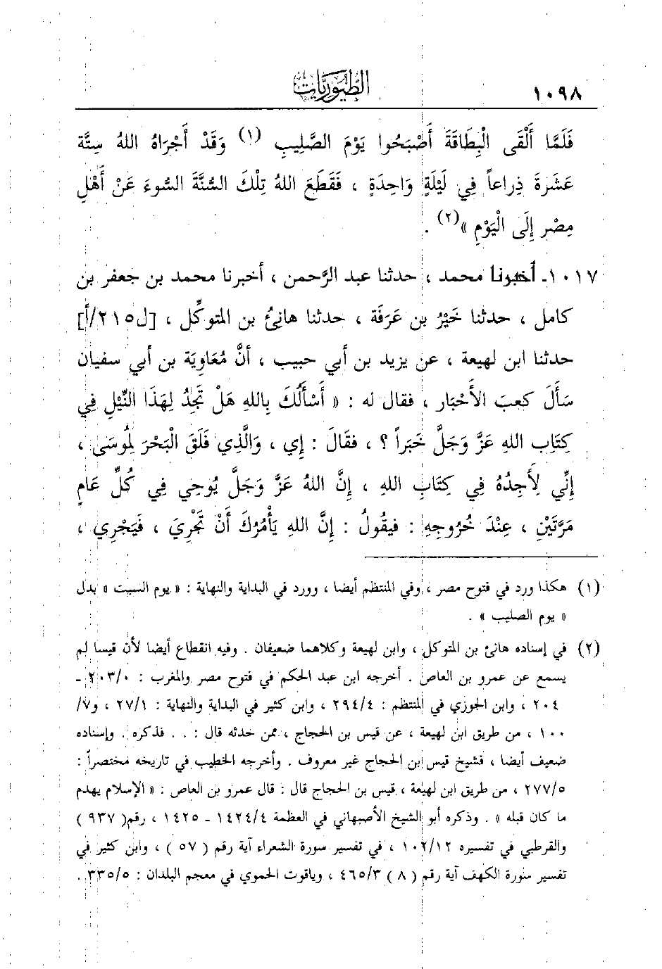1017 - أَخْبَرَنَا مُحَمَّدٌ، حَدَّثَنَا عَبْدُ الرَّحمن، أخبرنا محمد بن جعفر بن كامل، حدثنا خَيْرُ ابن عَرَفَة، حدثنا هانِئُ بن المتوكِّل، [ل215/أ] حَدَّثَنَا ابْنُ لَهِيعَةَ، عَنْ يَزِيدَ بن أبي حبيب، أنَّ مُعَاوِيَة بن أبي سفيان سَأَلَ كعبَ الأَحْبَار، فقال له: ((أَسْأَلُكَ بِاللهِ هَلْ تَجِدُ لِهَذَا النِّيْلِ فِي كِتَاِب اللهِ عَزَّ وَجَلَّ خَبَراً؟، فقَالَ: إِي، وَالَّذِي فَلَقَ الْبَحْرَ لِمُوسَى، إِنِّي ِلأَجِدُهُ فِي كِتَابِ اللهِ، إِنَّ اللهُ عَزَّ وَجَلَّ يُوحِي فِي كُلِّ عَامٍ مَرَّتَيْنِ، عِنْدَ خُرُوجِهِ: فيقُولُ: إِنَّ اللهِ يَأْمُرُكَ أَنْ تَجْرِيَ، فَيَجْرِي،
